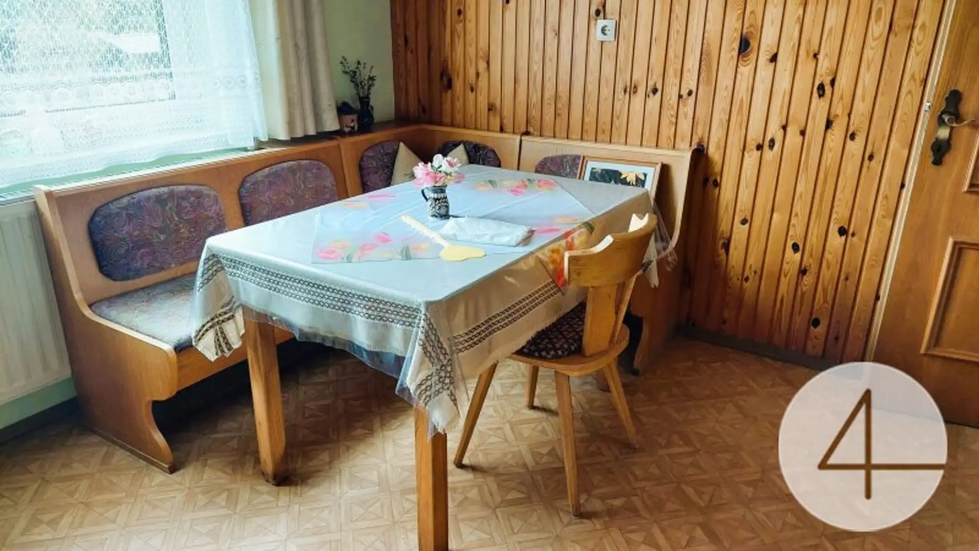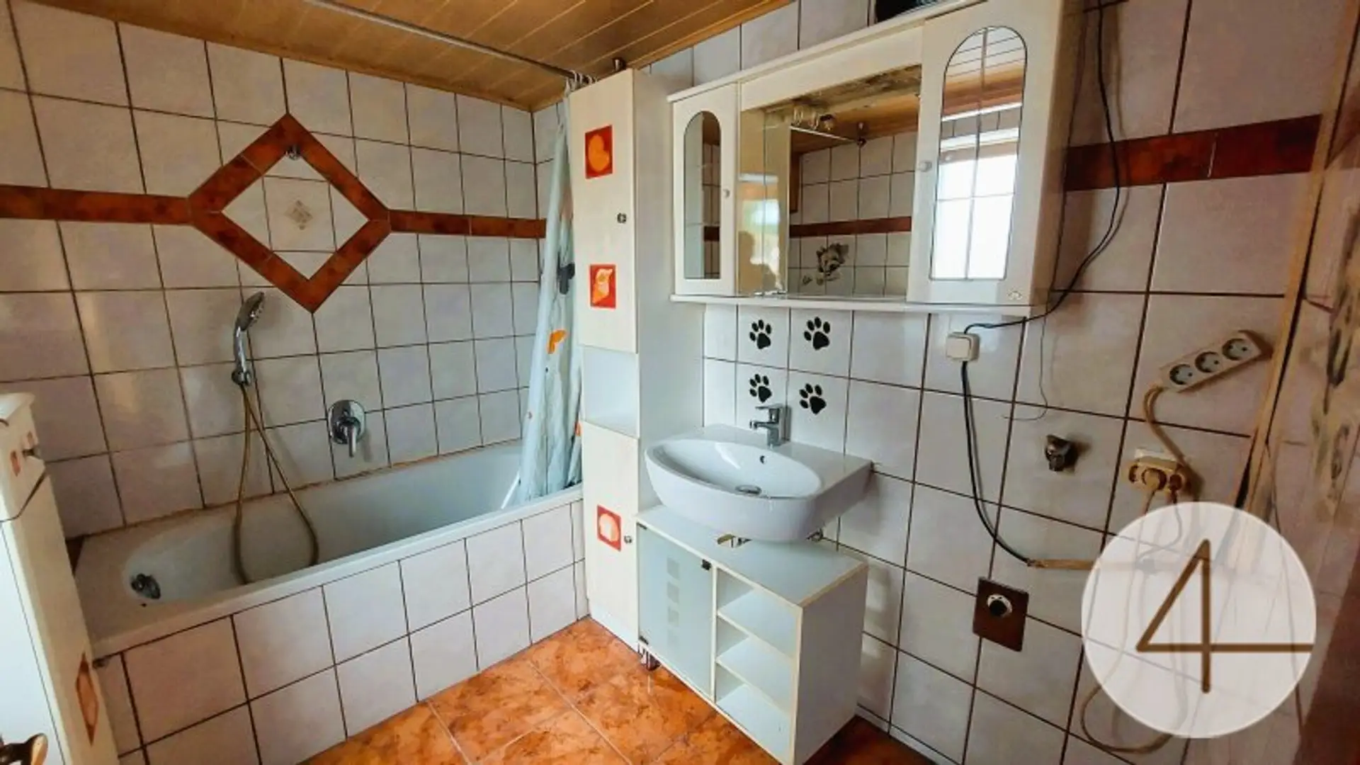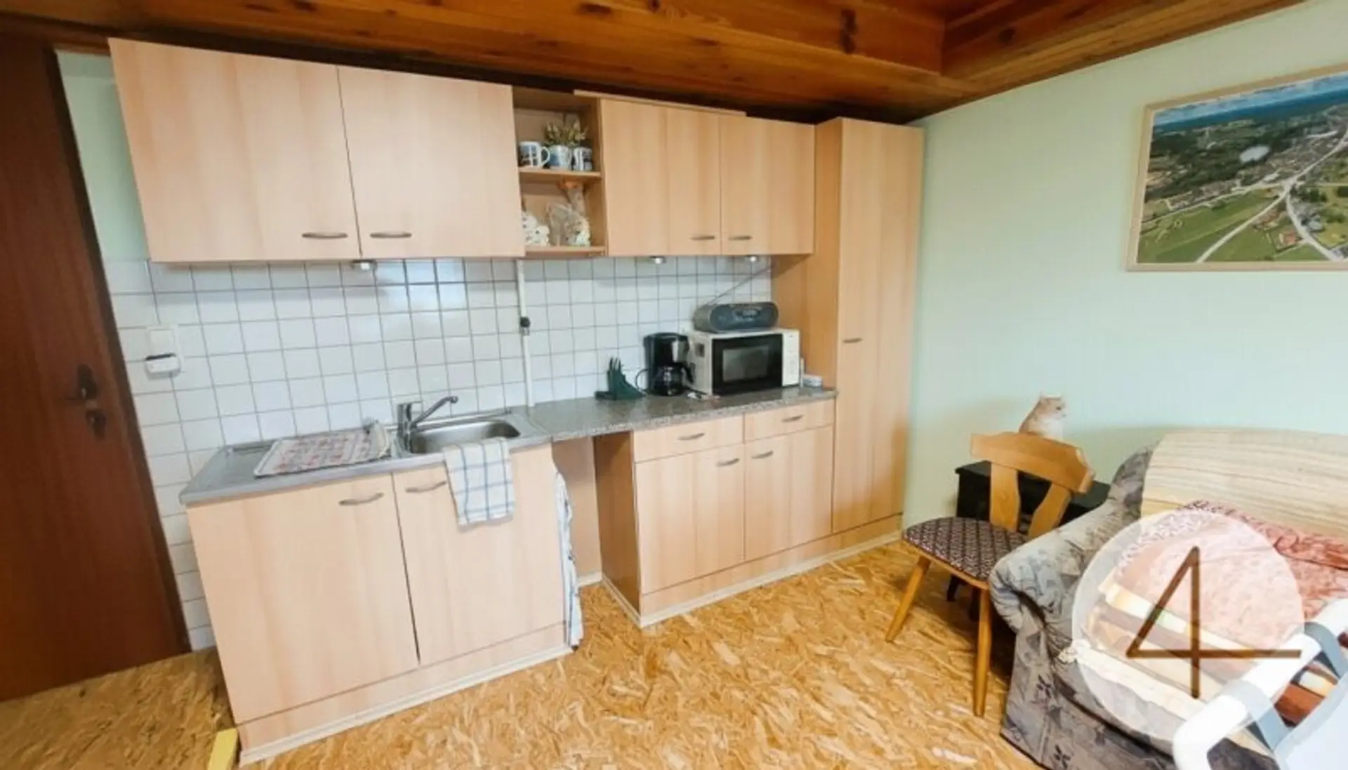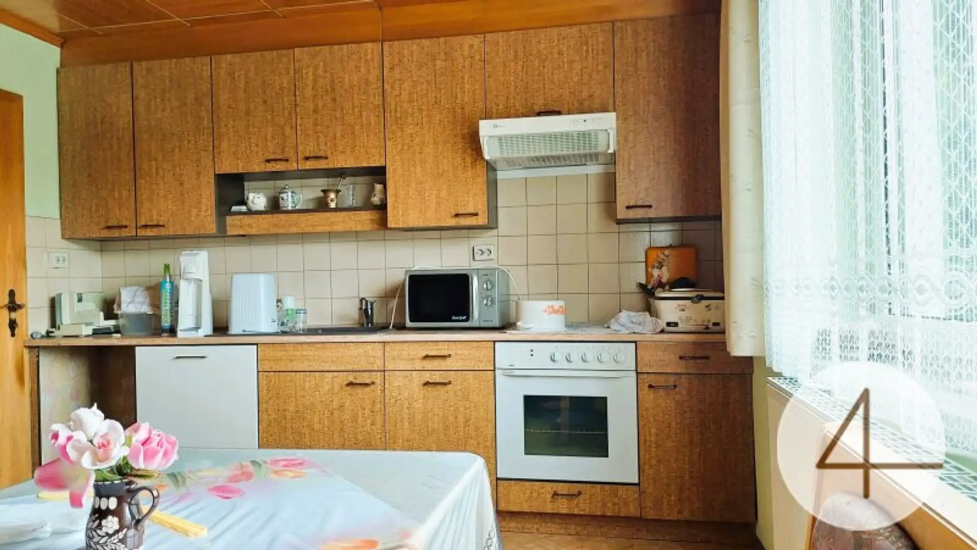 Vorraum, Bad mit Wanne, Schlafzimmer mit begehbarem Schrankraum, Küche mit Essplatz, großes Wohnzimmer mit Schwedenofen, Vorraum, geräumiger Dachboden,