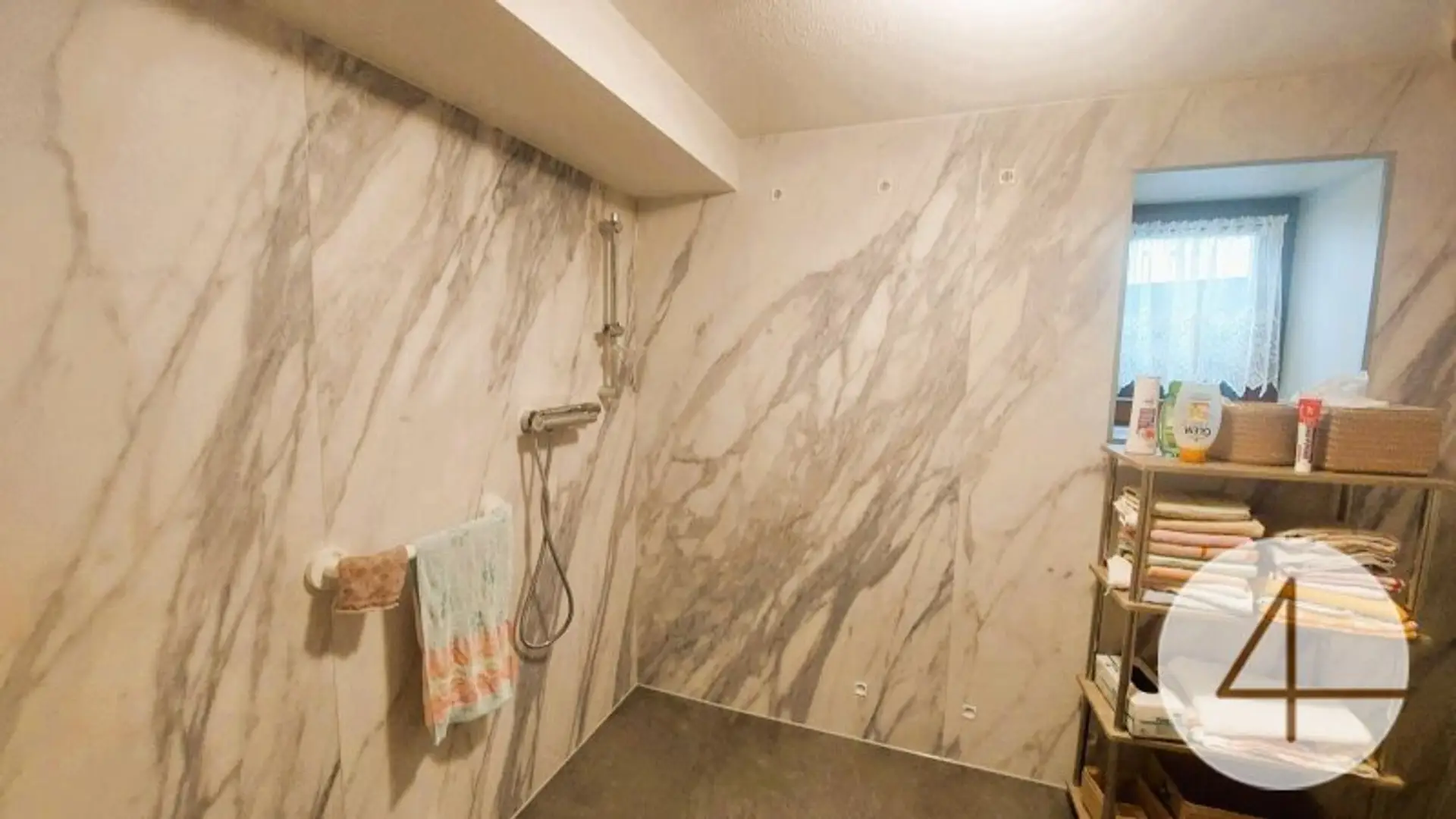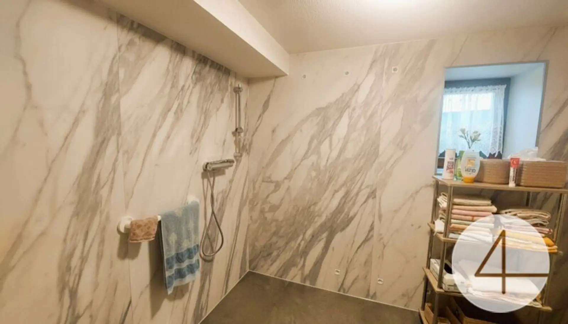 Im Erdgeschoss findet man eine große Wohnküche mit Ausgang in den Garten. Diese könnte natürlich als Partyraum genutzt werden. Hier wurde ein großes barrierefreies Badezimmer mit Dusche eingerichtet, WC und Vorraum, Aufgang in den ersten Stock;