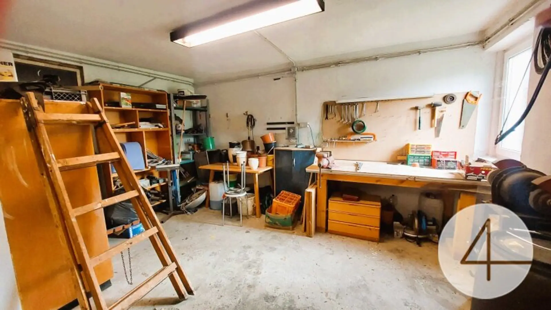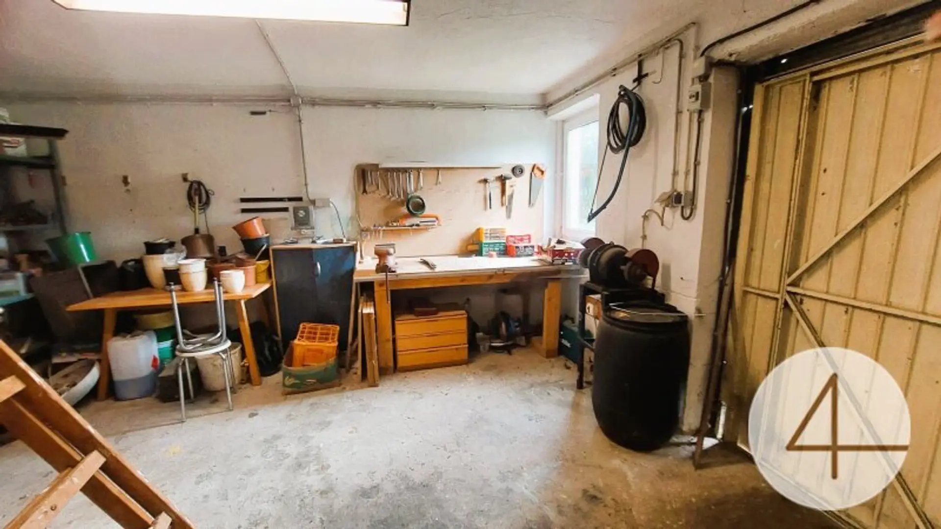 Haus 1 ist mit Haus zwei durch ein Nebengebäude verbunden. Hier befindet sich eine Garage mit Montagegrube, Werkstatt mit Werkbank und Ausgang in den Garten und viel Stauraum.