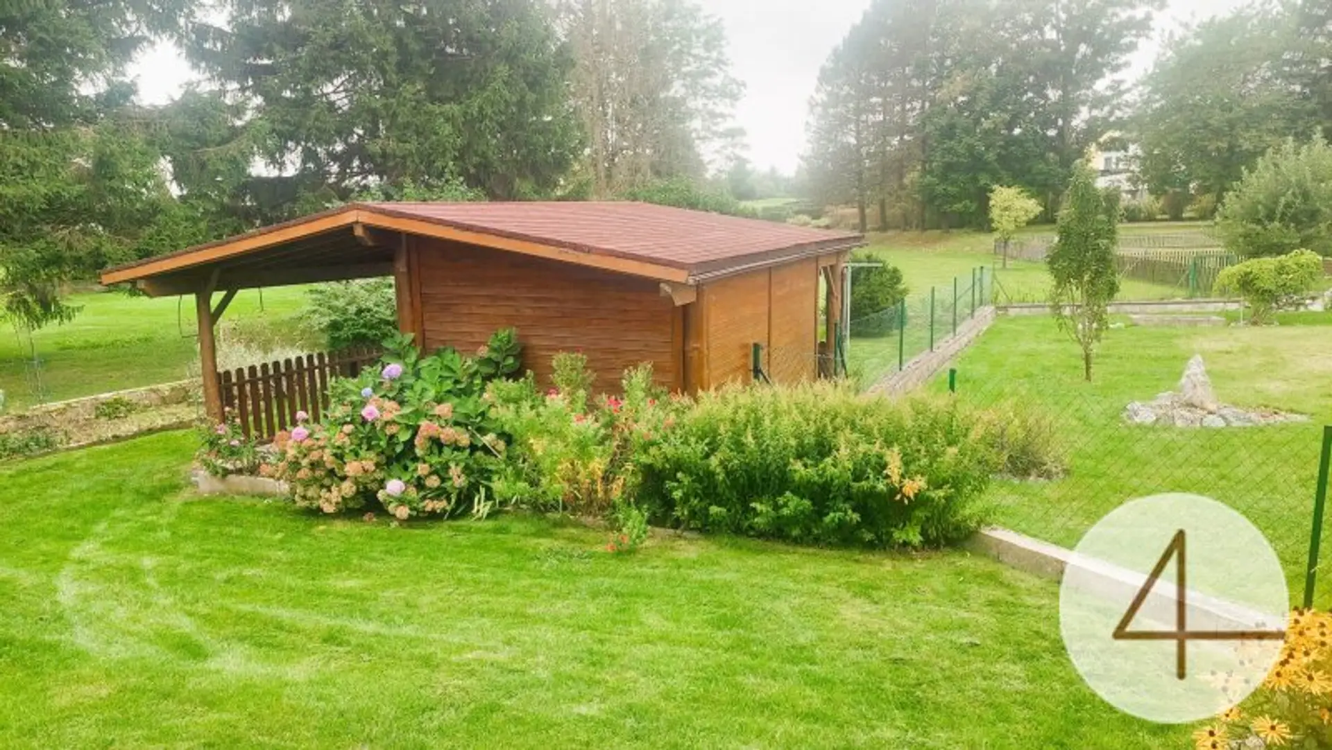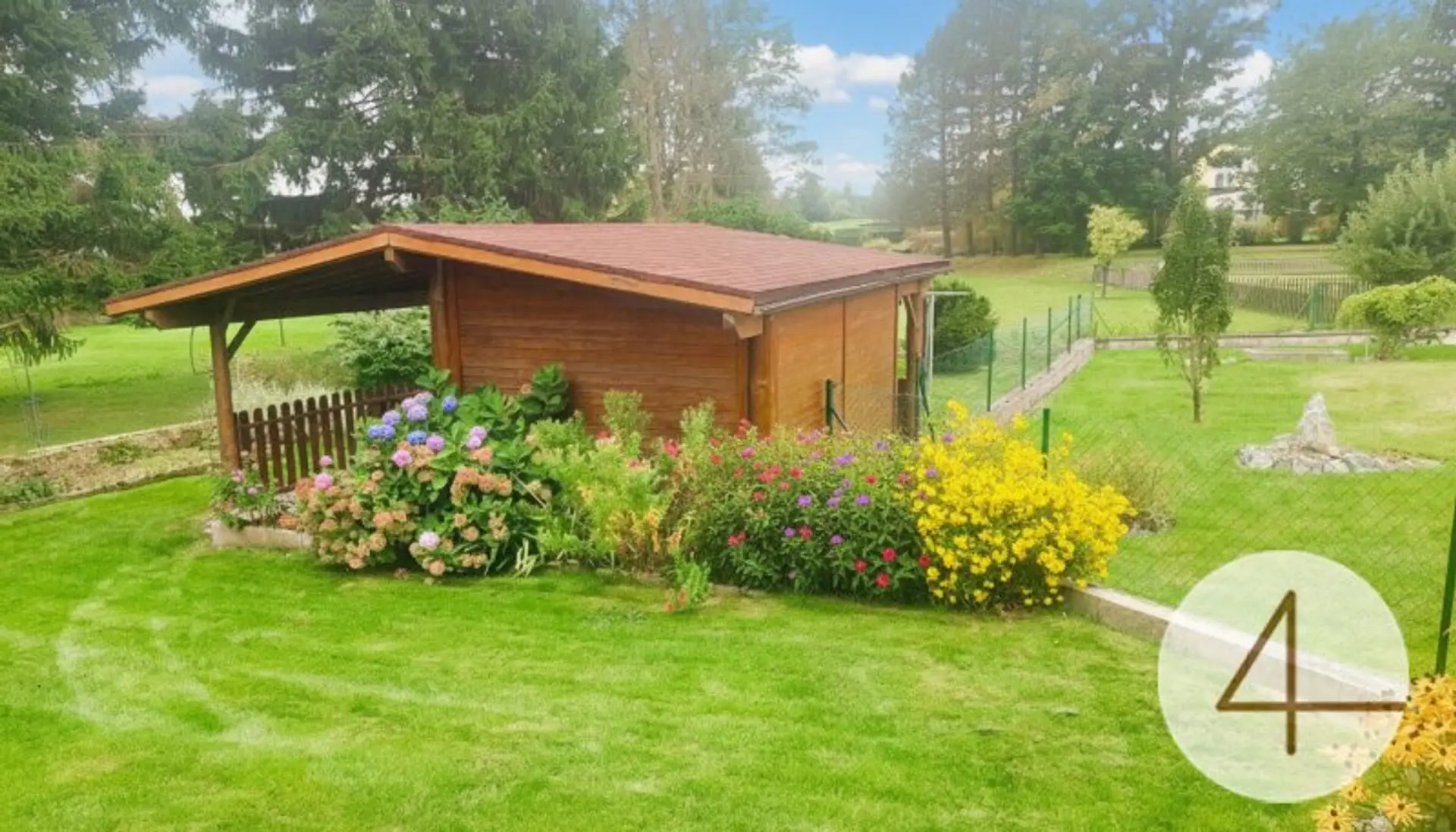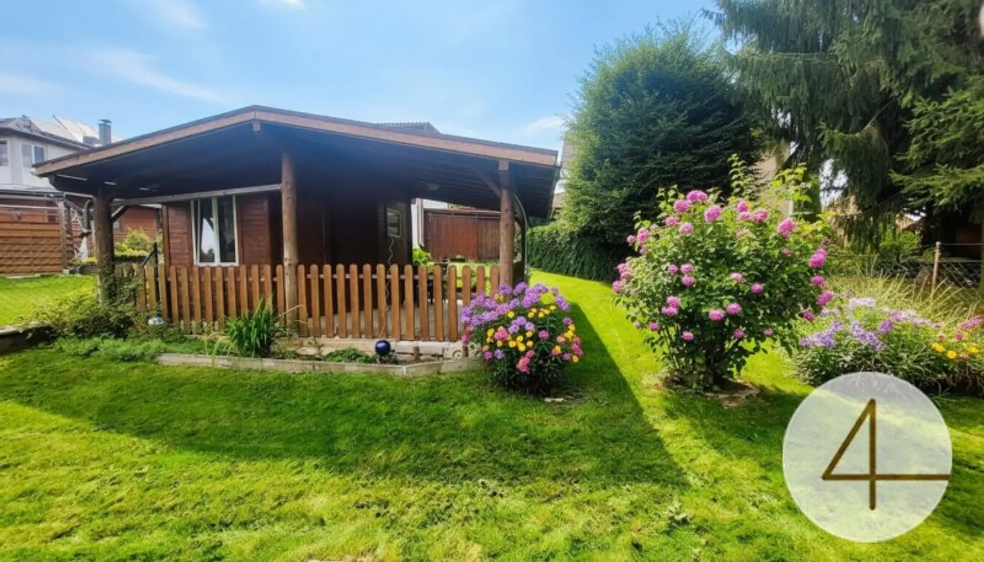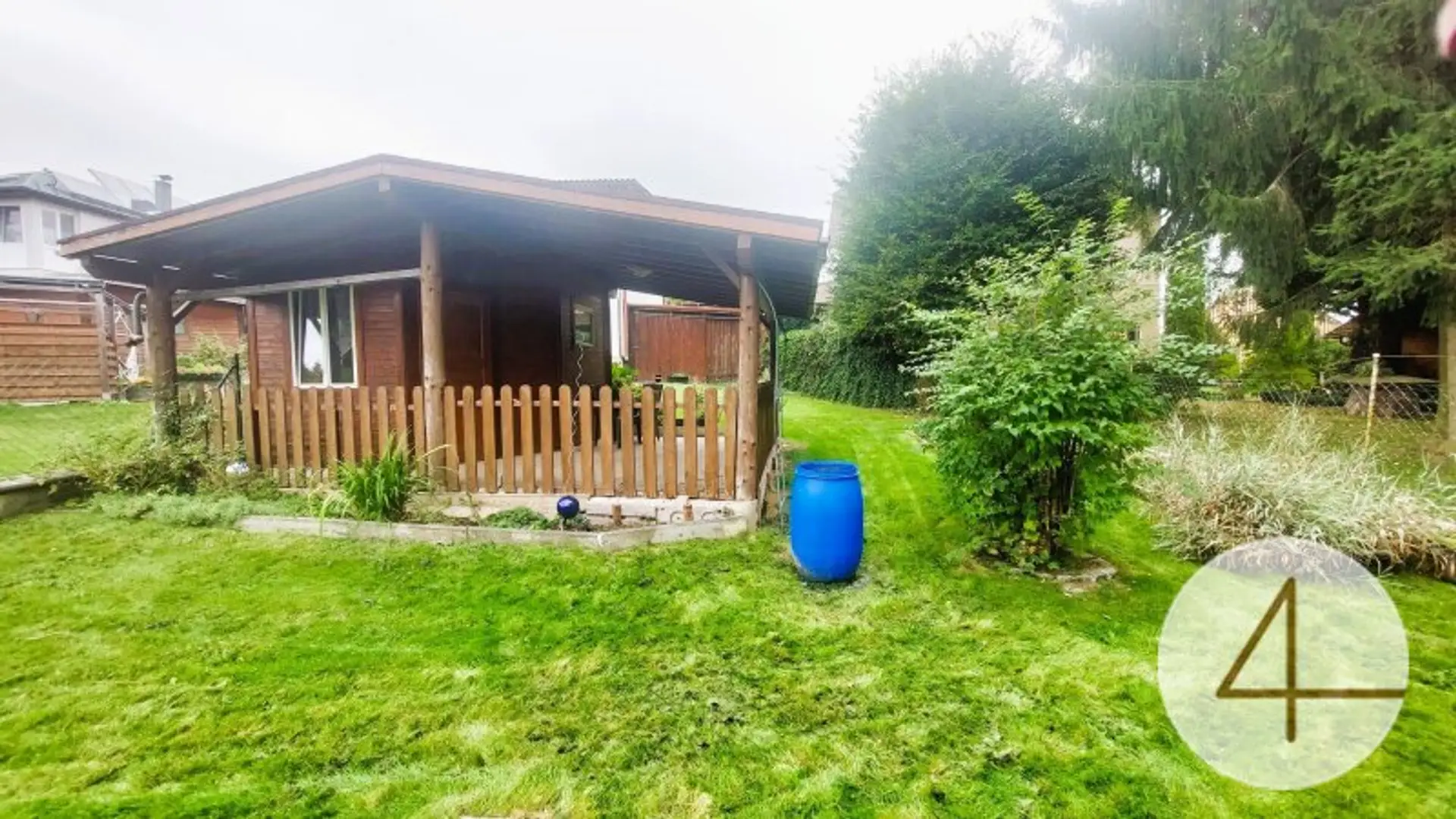 Der Garten ist eben und vollständig eingezäunt und wartet mit seinem Gartenhäuschen und viel Grün auf.