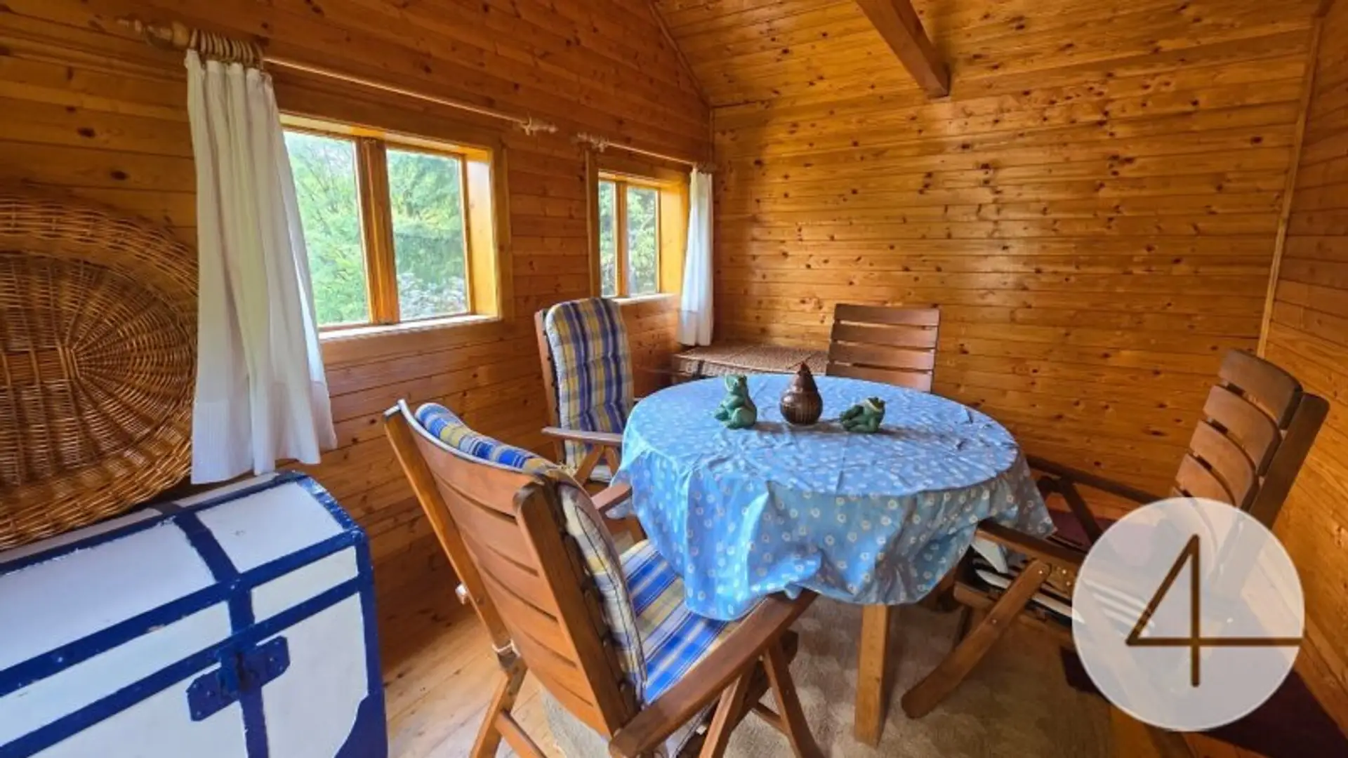 Die Gartenhütte, mit gemütlicher Innenausstattung, schützt auch bei Regen - somit steht einem Sommerabend im Freien nichts im Weg.
