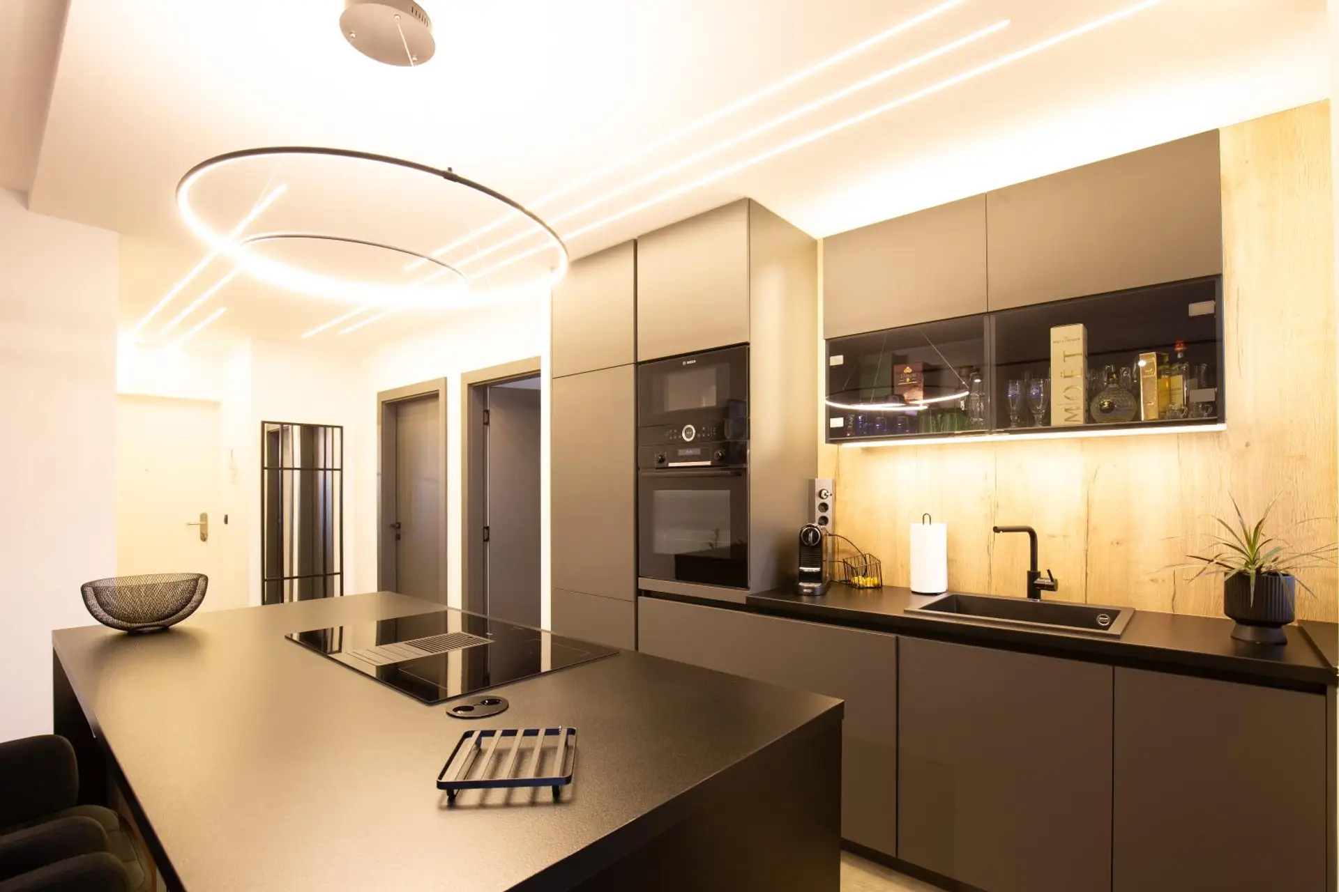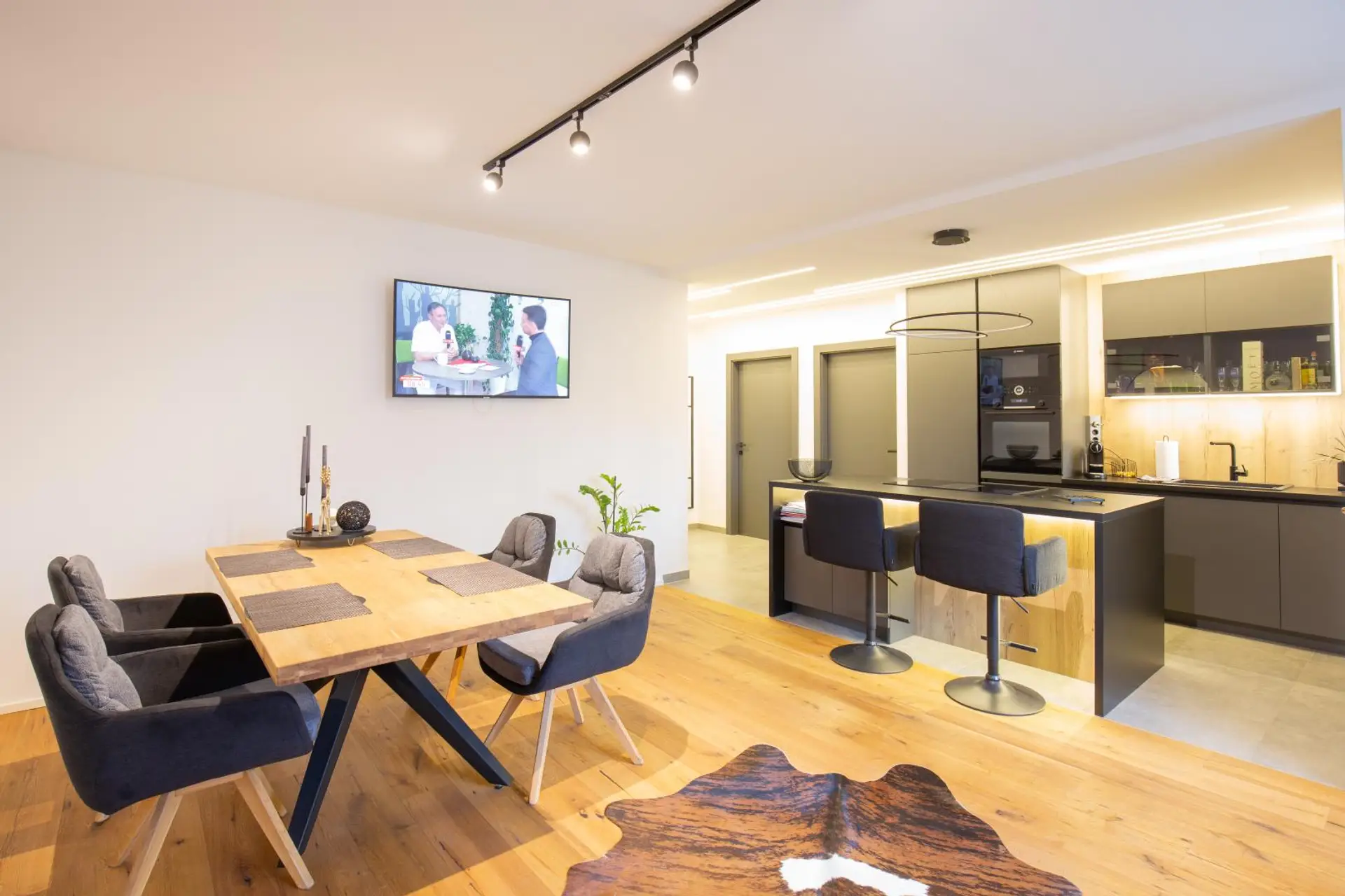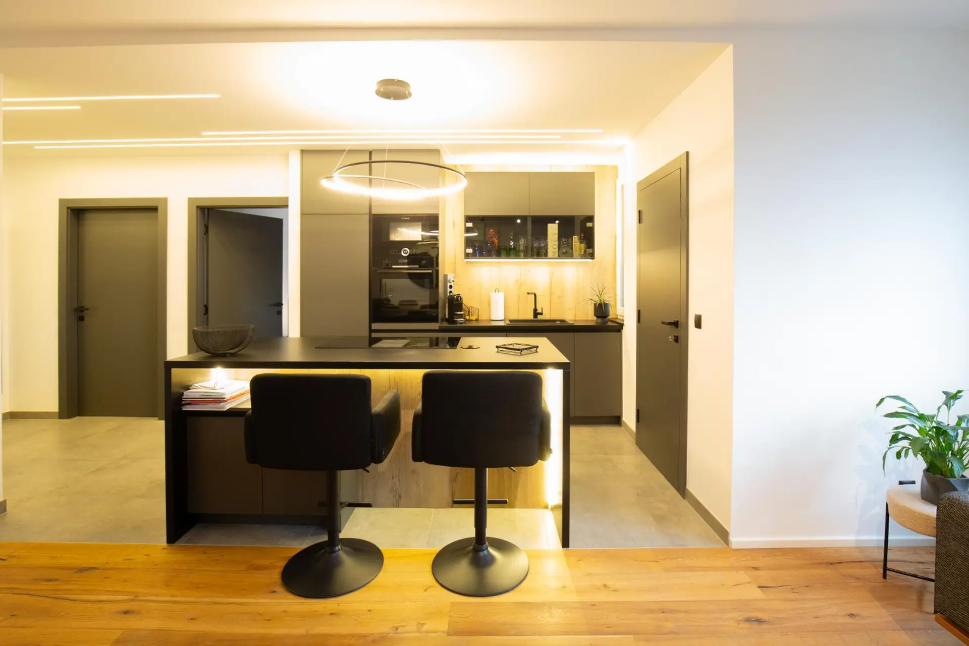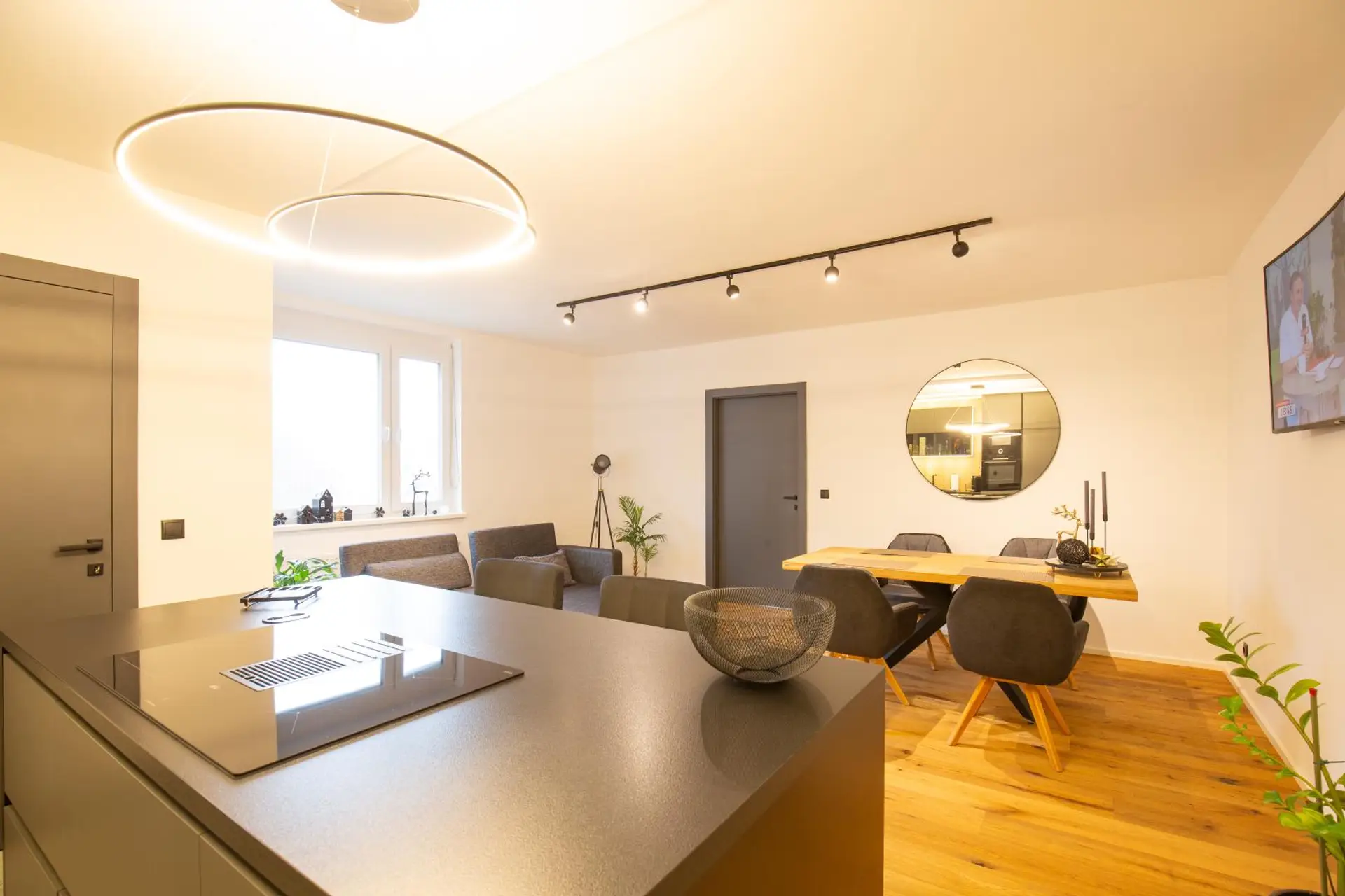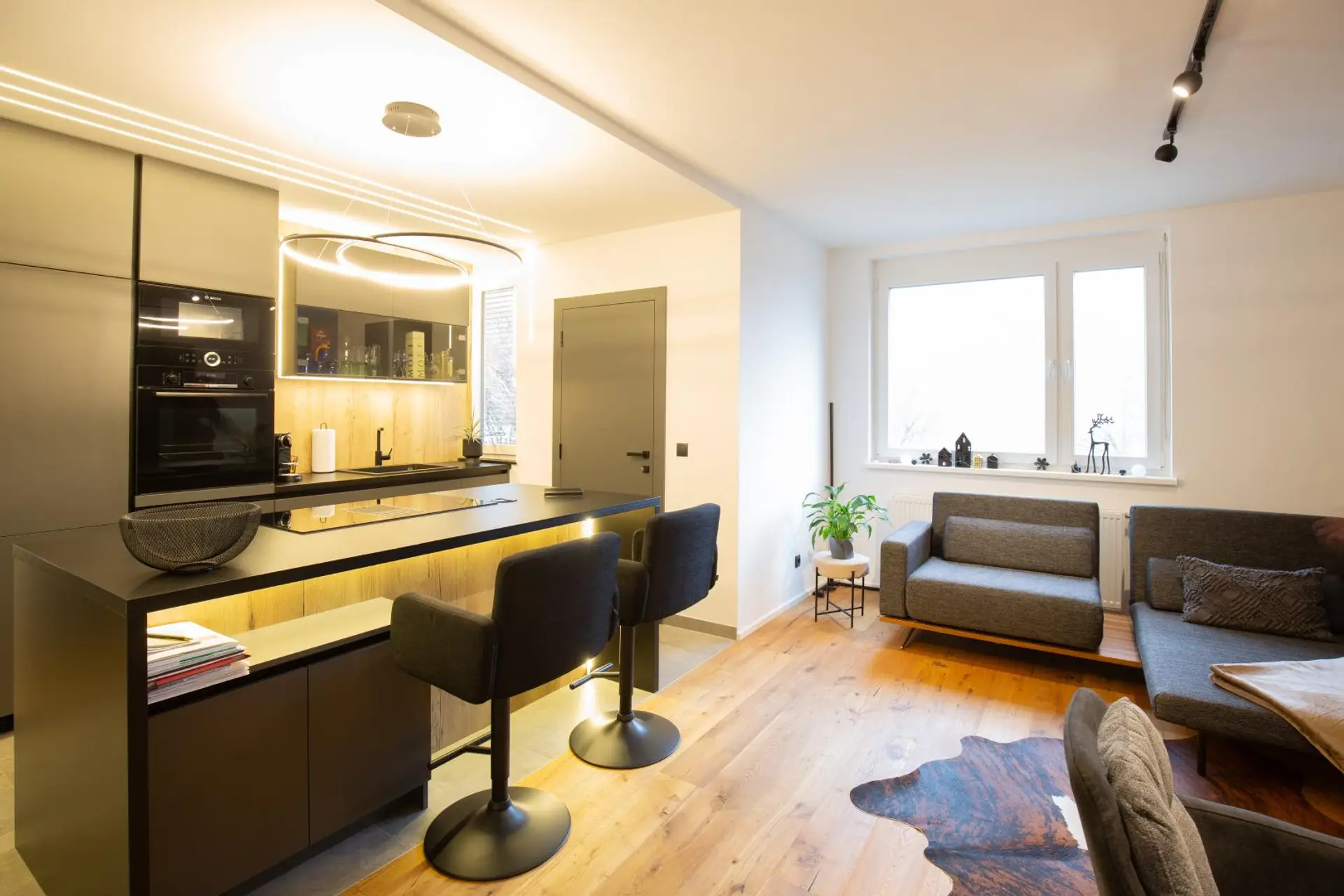 - Offener Wohn-/Koch-/Essbereich (rund 28,8 m²) mit moderner Tischlerküche und BOSCH-bzw AEG Geräten