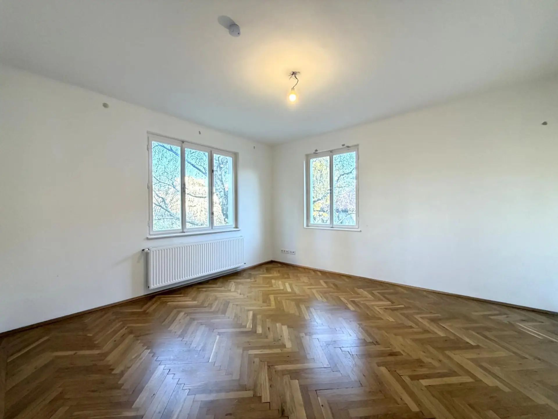 Aus dem zentralen Vorraum gelangen Sie in das ca. 21 m² große Wohnzimmer, die mit dem Wohnzimmer verbundene, offene ca. 8 m² große Küche, ein zweites Zimmer mit ca. 18 m² und ein drittes, ca. 8 m² großes Kabinett.