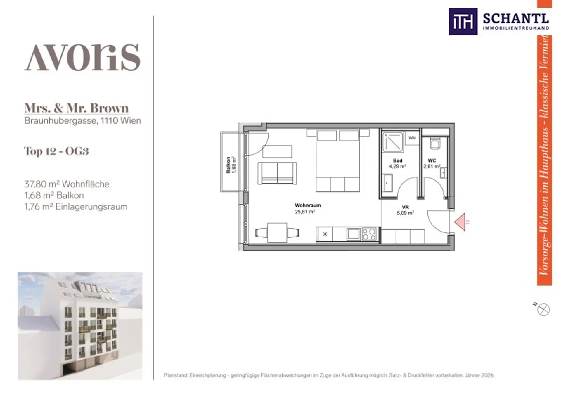 Wohnfläche: ca. 37,80m² + Balkon: ca. 1,68m² + Kellerabteil: ca. 1,76m²