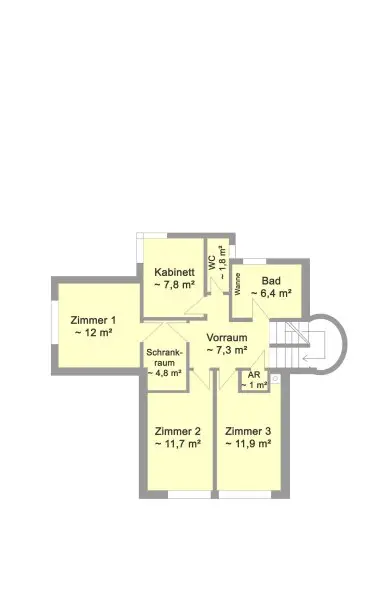 Im Obergeschoß wird, wo vom zentralen Vorzimmer ausgehend, ein Bad, ein separates WC, ein Abstellraum sowie ein südwestlich ausgerichtetes Zimmer mit Schrankraum, zwei südöstliche Zimmer, sowie ein Kabinett geboten .