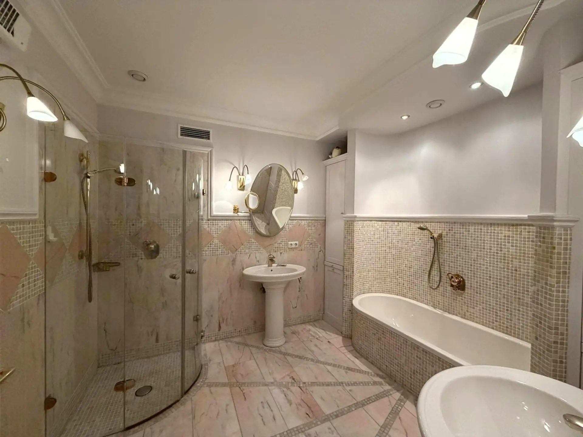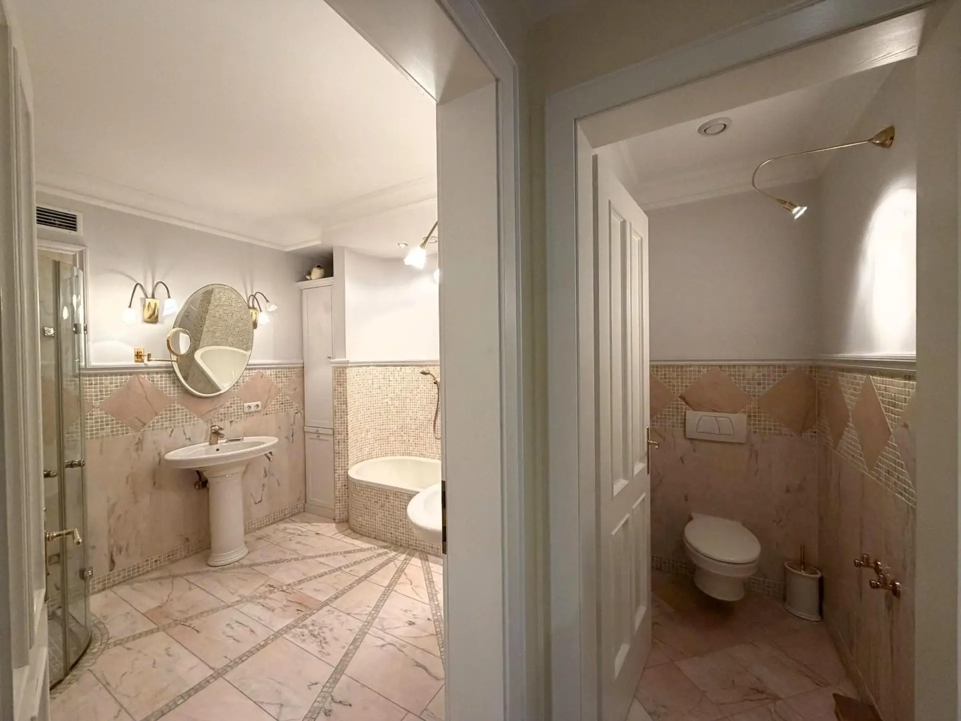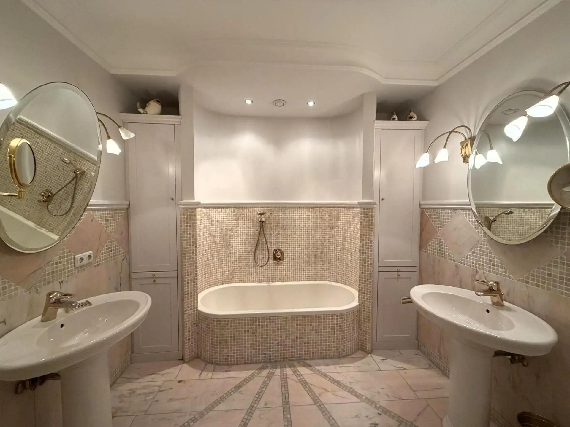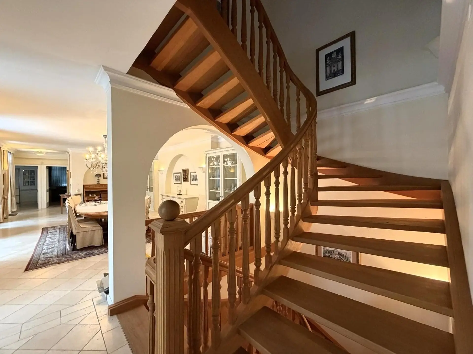 und insgesamt 859,91 m² Nutzfläche entfaltet sich das Haus über Erdgeschoss, Dachgeschoss und ein vollständig ausgebautes Kellergeschoss. Die nüchterne Statistik spricht von 7 Zimmern, 4 möglichen Schlafzimmern, 4 Bädern und 5 Toiletten – doch diese Zahlen werden der Wirkung dieses Hauses nicht gerecht. Hier geht es nicht um Raumanzahl, sondern um Raumqualität, schlicht, eine gehobene Wohnkultur.