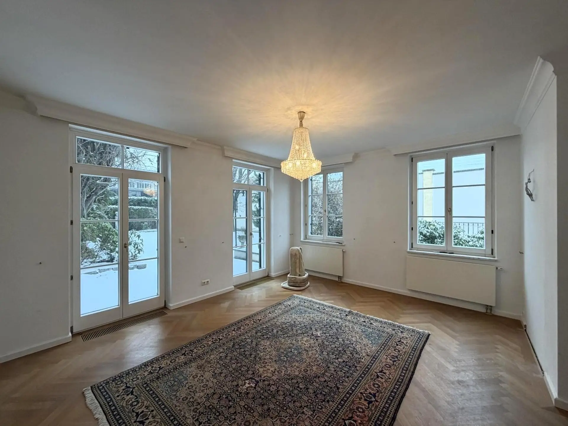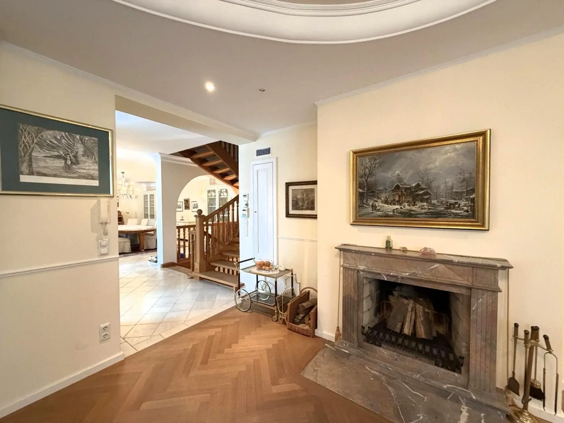 an impressive 62 m² ballroom unfolds, representative, flooded with light, and—when desired—a stage for social occasions of the highest standard. Seamlessly adjoining is an elegant salon, featuring an open fireplace—an ensemble of openness, fire, and atmosphere.
