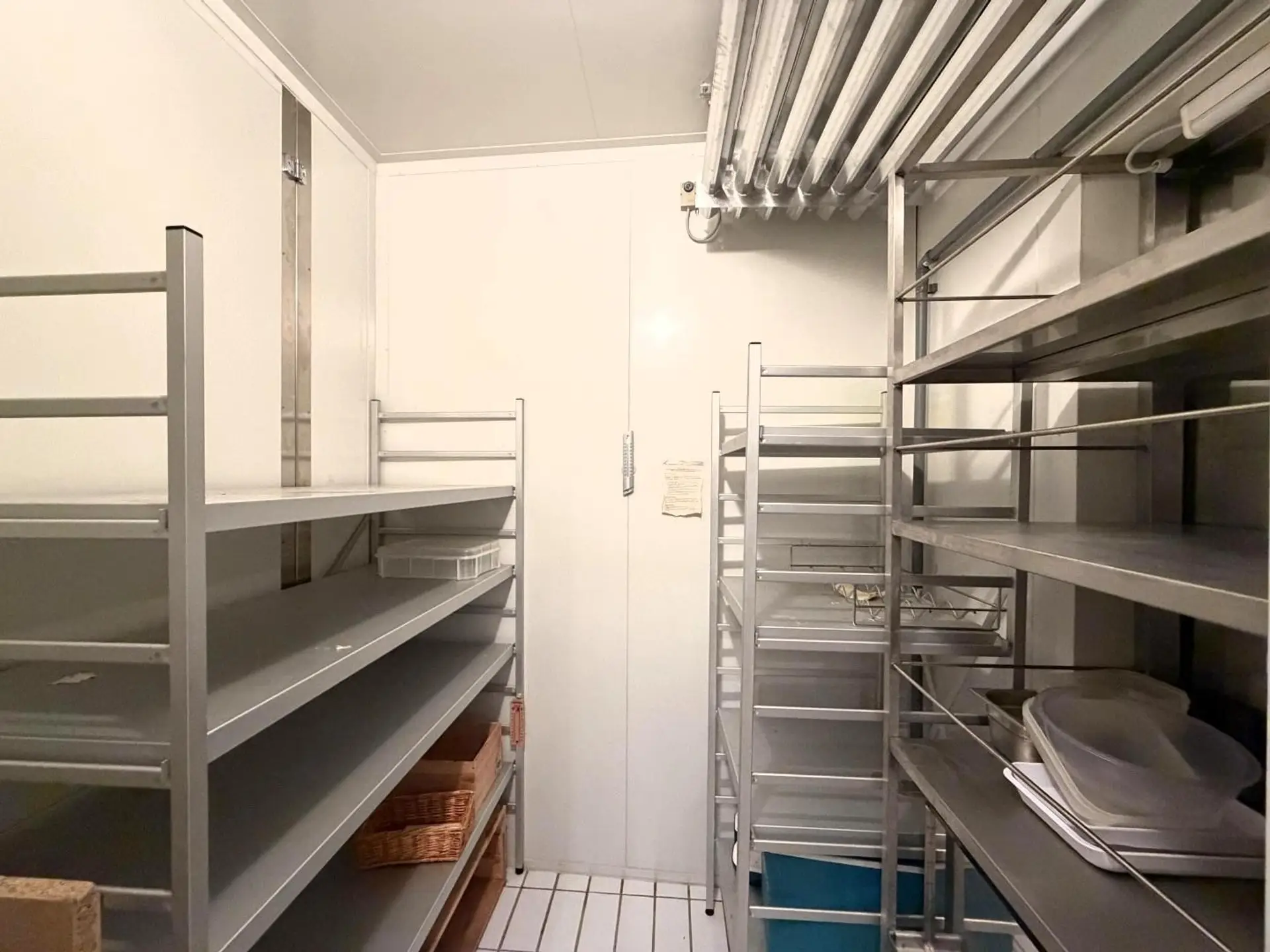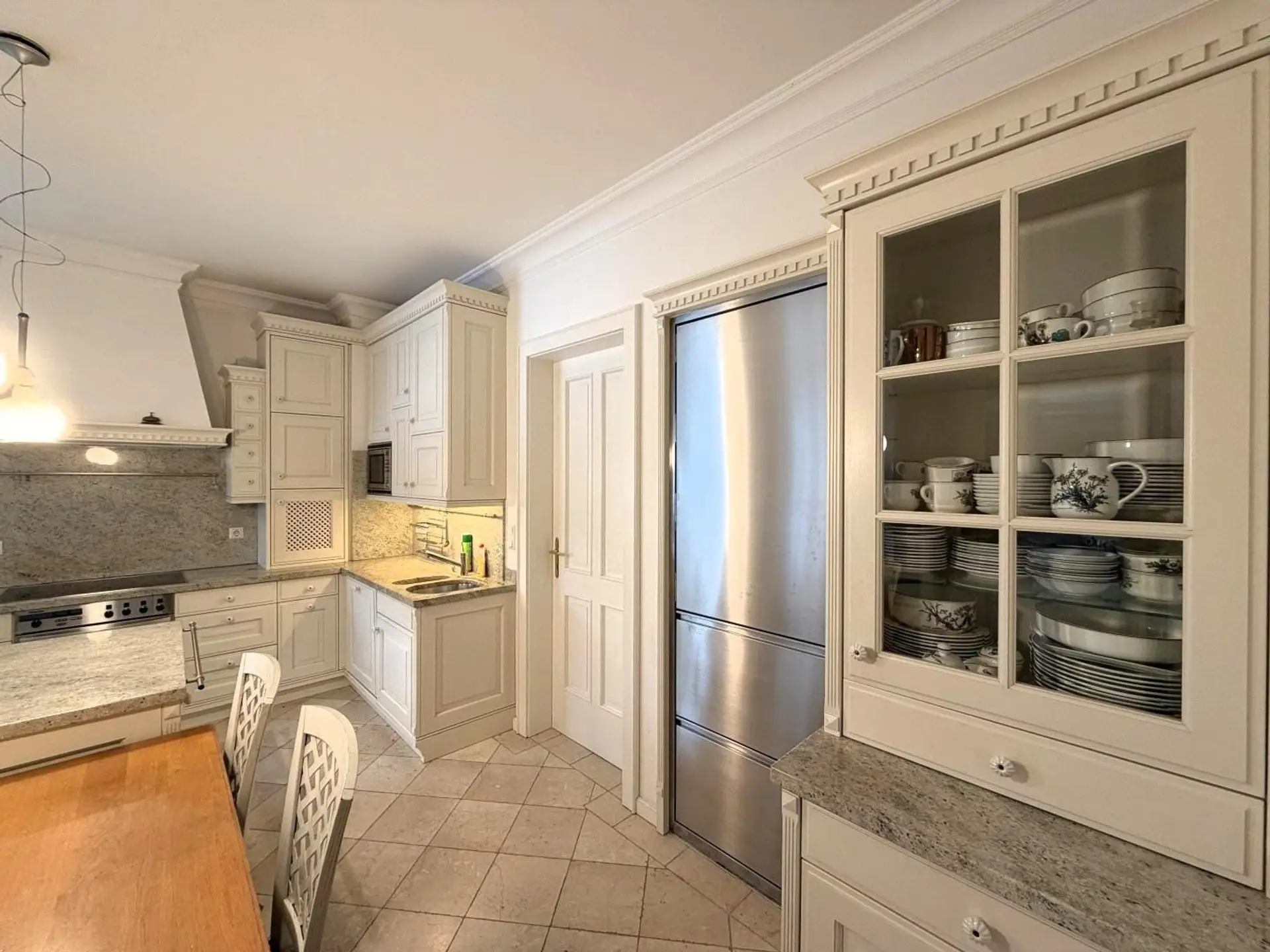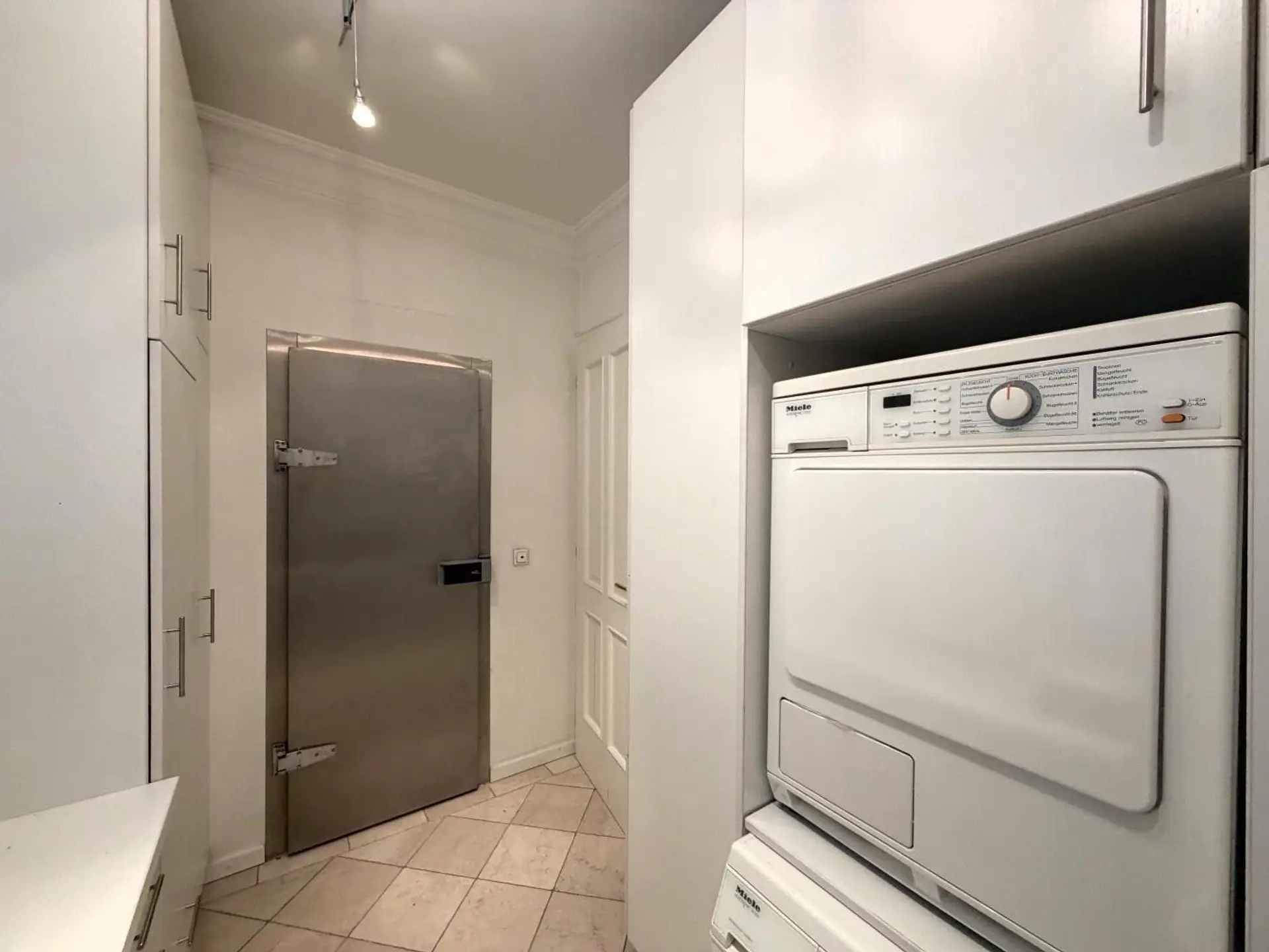 Von der Autoeinfahrt führt ein separater Nebeneingang direkt in den Wirtschaftsbereich. Einkäufe gelangen auf kürzestem Wege ins Haus, vorbei an der Kühlkammer und angrenzender Küche – eine Lösung, die den Alltag elegant und unsichtbar organisiert.