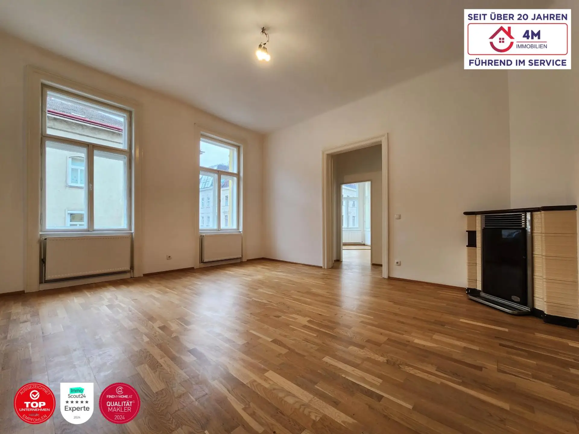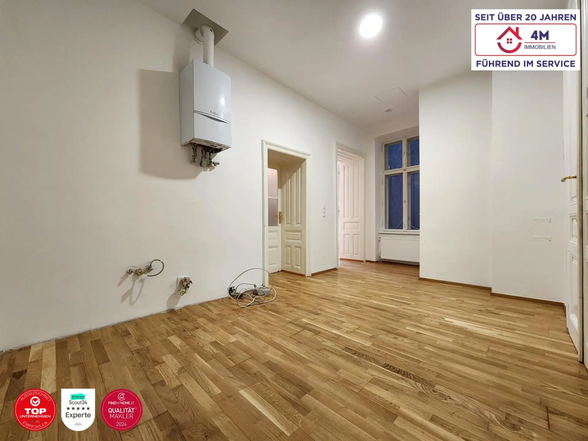 - Exklusive Altbaudetails: Fischgrätparkett, Flügeltüren, Doppelkastenfenster