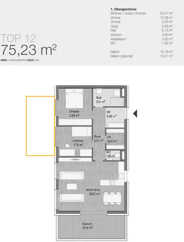 Top 12: 75,23 m² mit 15,18 m² Balkon