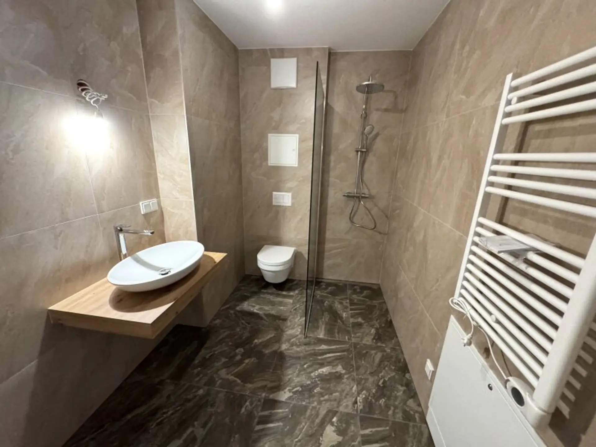 * Badezimmer mit einer Dusche, einem Waschbecken, einer Toilette und einem Waschmaschinenanschluss