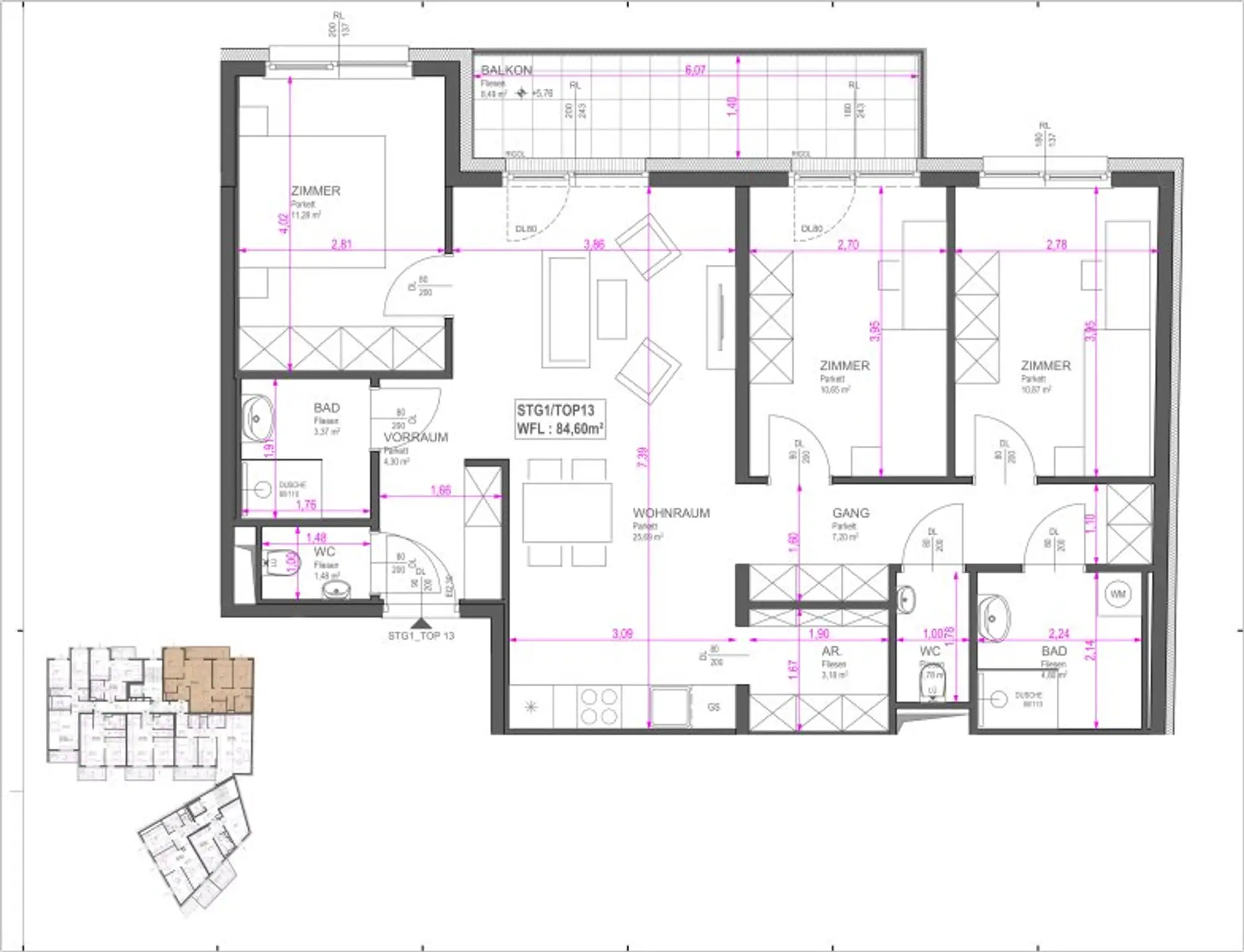 Die Wohnung verfügt über eine Wohnfläche von ca. 84,60qm, einem Balkon mit ca. 8,49qm und gliedert sich in folgende Raumaufteilung: