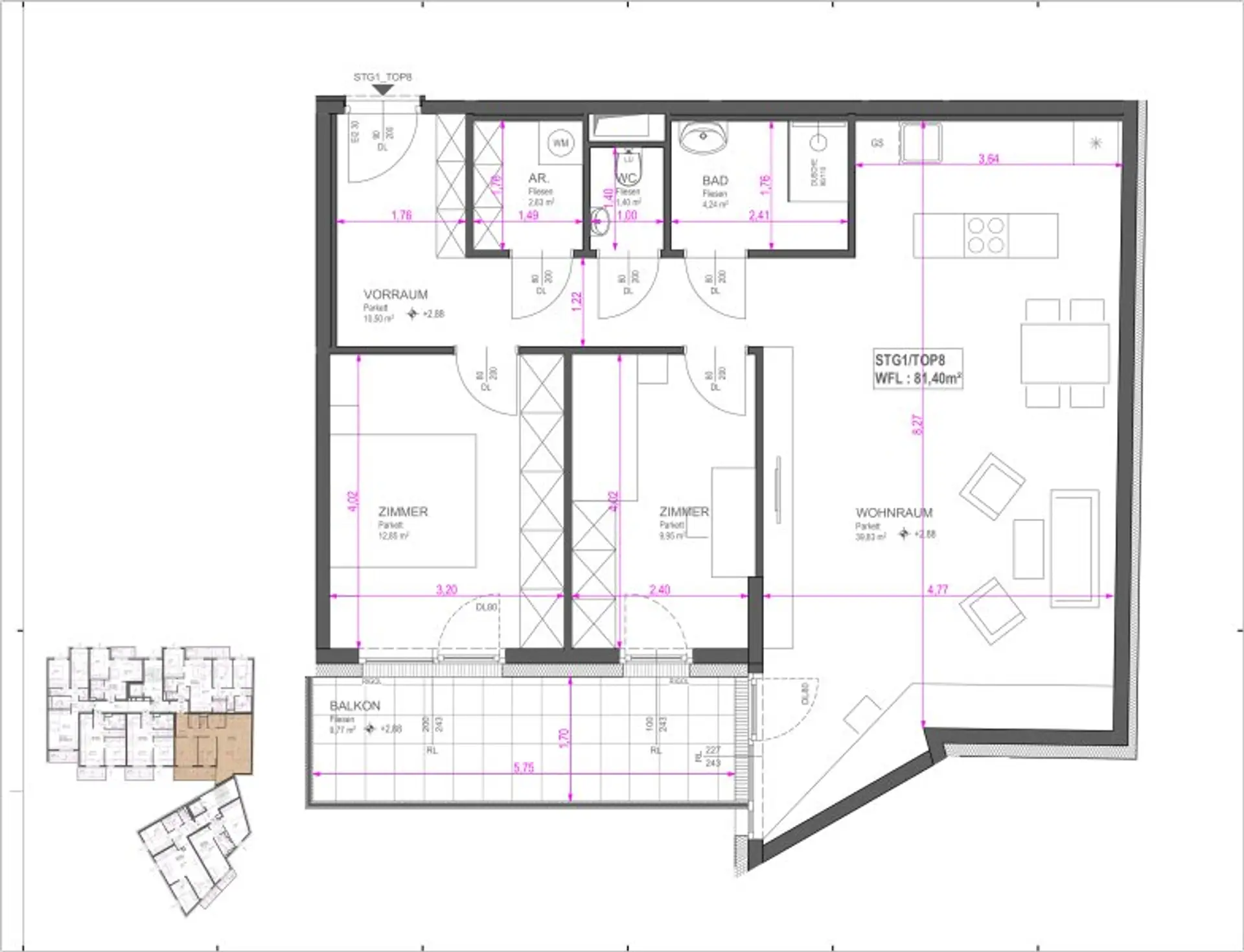 Die Wohnung verfügt über eine Wohnfläche von ca. 81,40qm, einem Balkon mit ca. 9,77qm und gliedert sich in folgende Raumaufteilung: