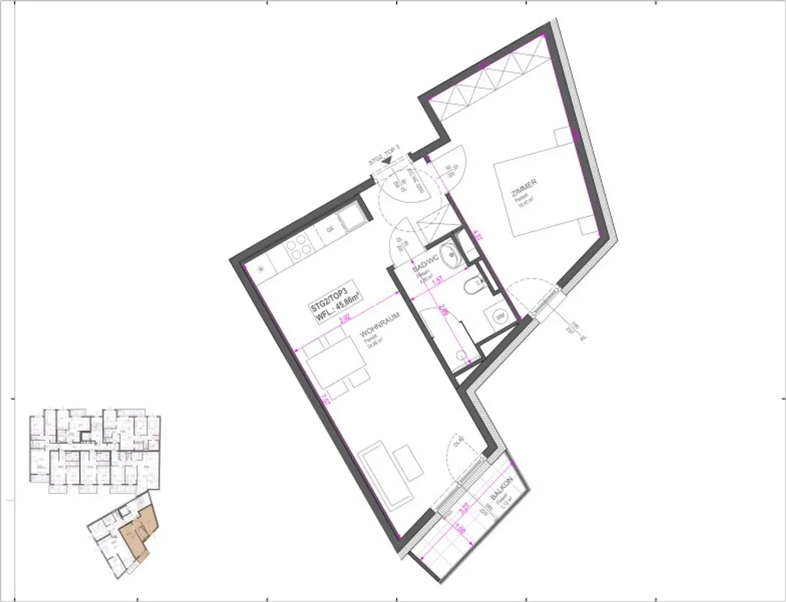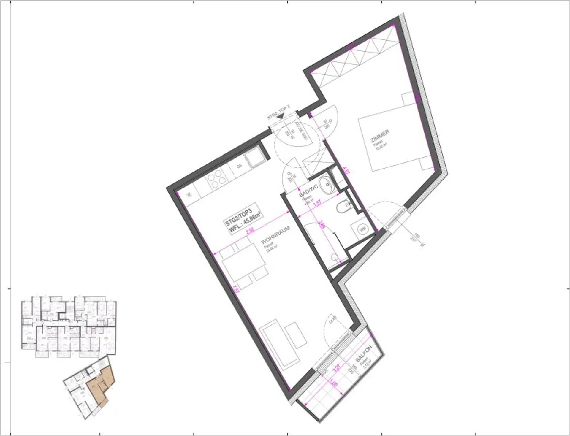 Die Wohnung verfügt über eine Wohnfläche von ca. 45,86qm, einem Balkon mit ca. 3,12qm und gliedert sich in folgende Raumaufteilung: