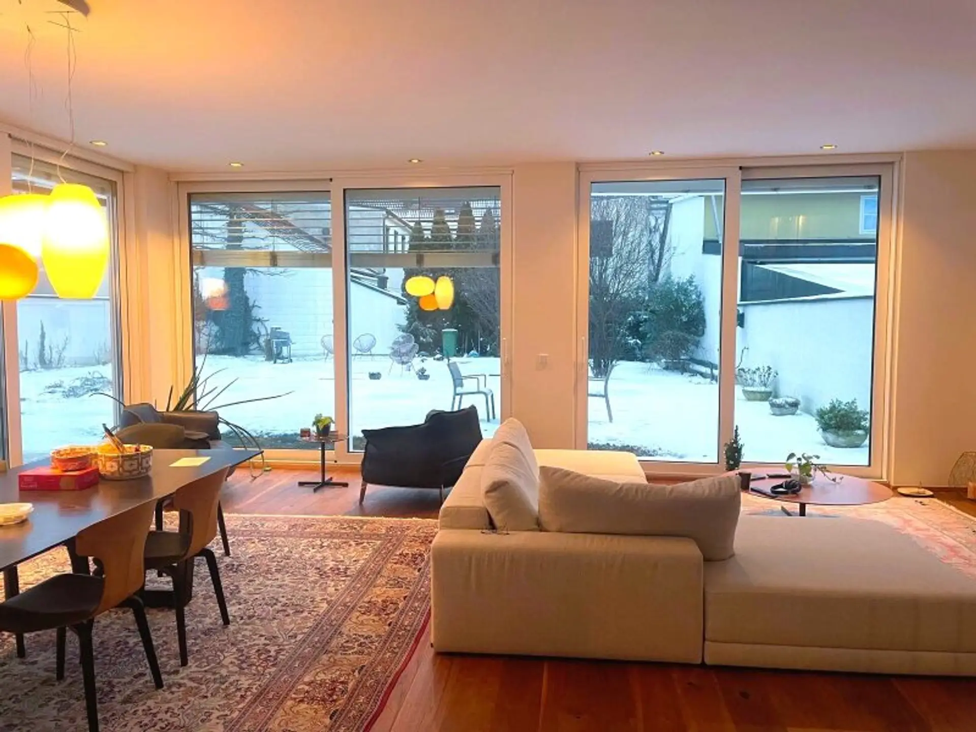 Im Erdgeschoß befindet sich ein großes Wohnzimmer, südöstlich verglaste Wände mit Zugang zu 2 Terrassen und zum großen eingefriedeten Garten im EIGENTUM.