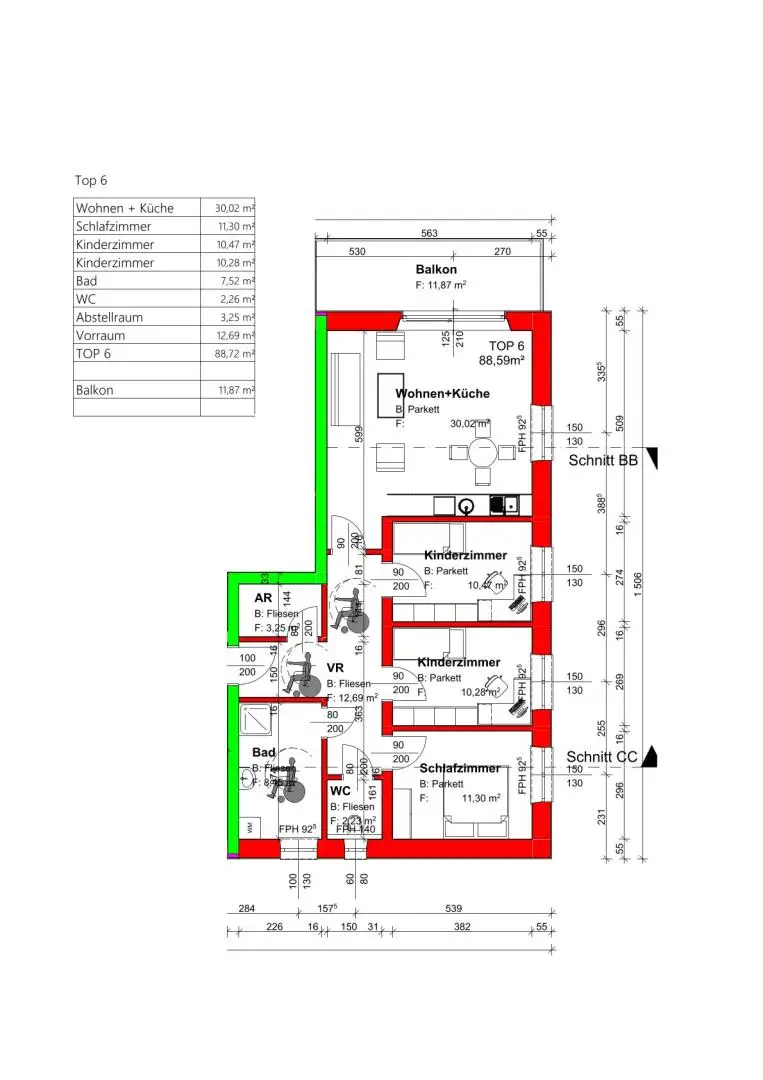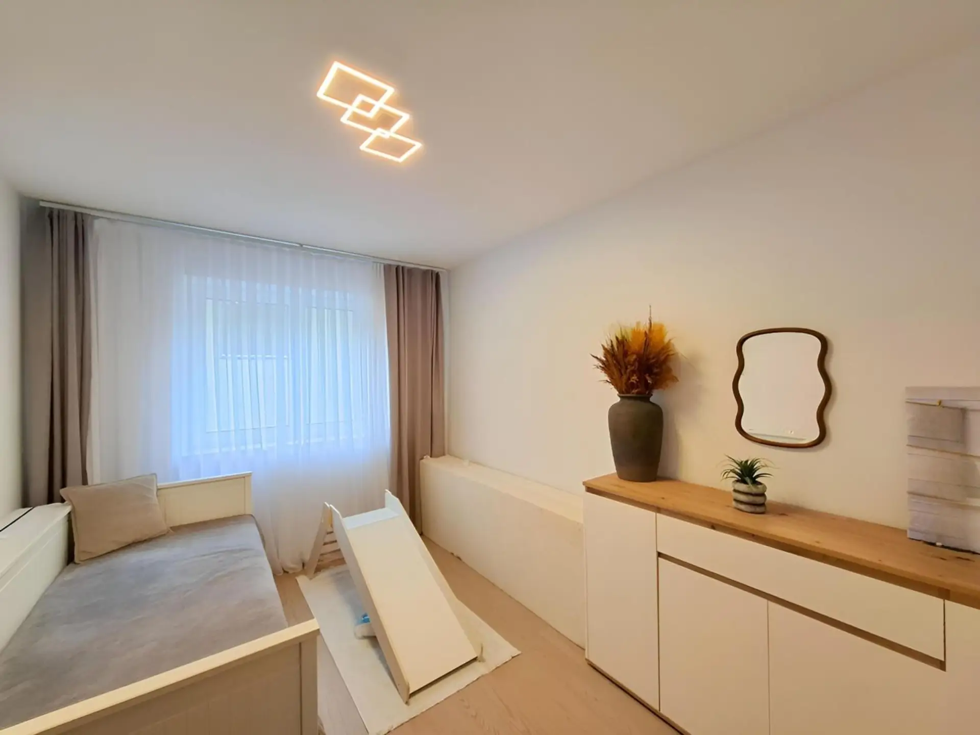 3 Schlafzimmern, Bad, WC, Abstellraum und Diele.