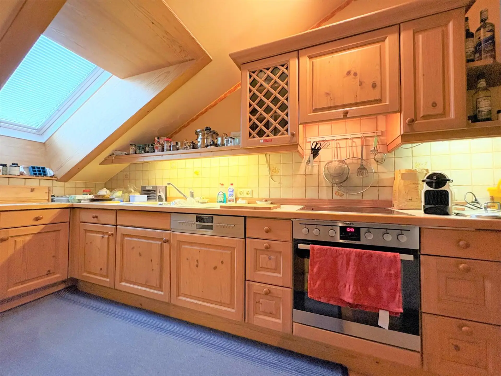 Vom Eingangsbereich mit Garderobe gelangen Sie in sämtliche Zimmer der Wohnung. Beide Schlafzimmer sind mit einem Dachflächenfenster ausgestattet und werden so von Tageslicht erhellt. Ein Badezimmer mit Dusche, Waschmaschinenanschluss und großem Waschbecken, ein separates WC sowie ein Abstellraum befinden sich gegenüber der beiden Zimmer. Über den Wohn-Essbereich mit integriertem Kaminofen gelangt man auf die Loggia. Von dort aus genießt man die Aussicht über Bad Ischl sowie das umliegende Gebirge. Um zusätzliche Staufläche zu schaffen, verfügt die Loggia über einen eigenen kleinen Abstellraum. Die Küche mit sämtlichen, notwendigen E-Geräten rundet das Angebot gekonnt ab. Ein Kellerersatzraum befindet sich im Dachboden des Wohnhauses.