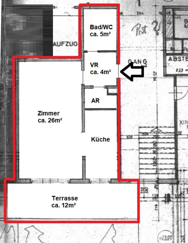 Vorzimmer, Wohn-Schlafzimmer, Küche, Terrasse, Bad / WC, Abstellraum