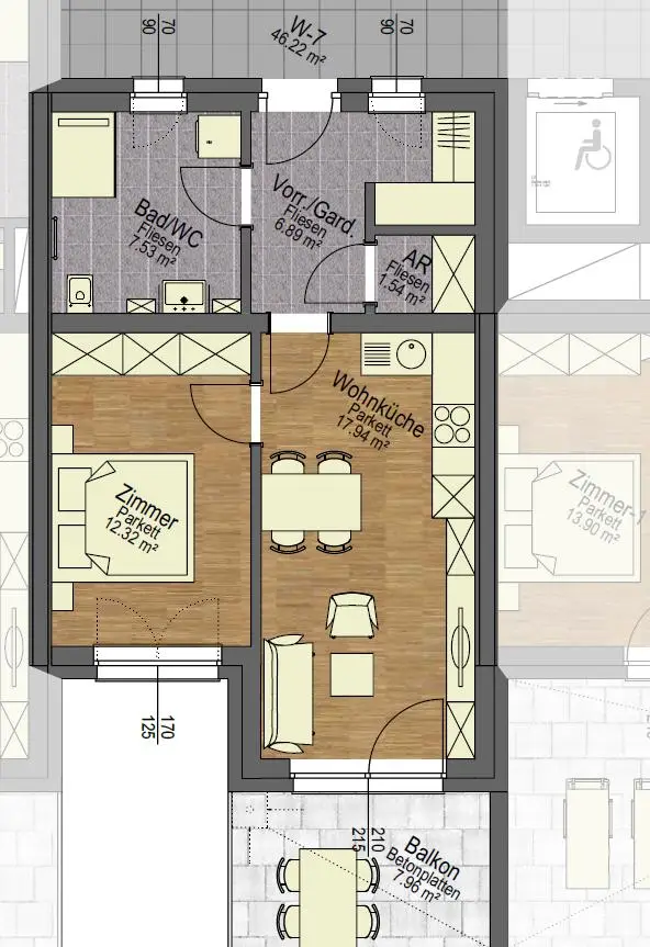 ca. 46 m² Wohnfläche und ca. 8 m² Balkon, Barrierefrei, moderner Küchen-Wohn-Essbereich, 1 Schlafzimmer und Kellerraum,