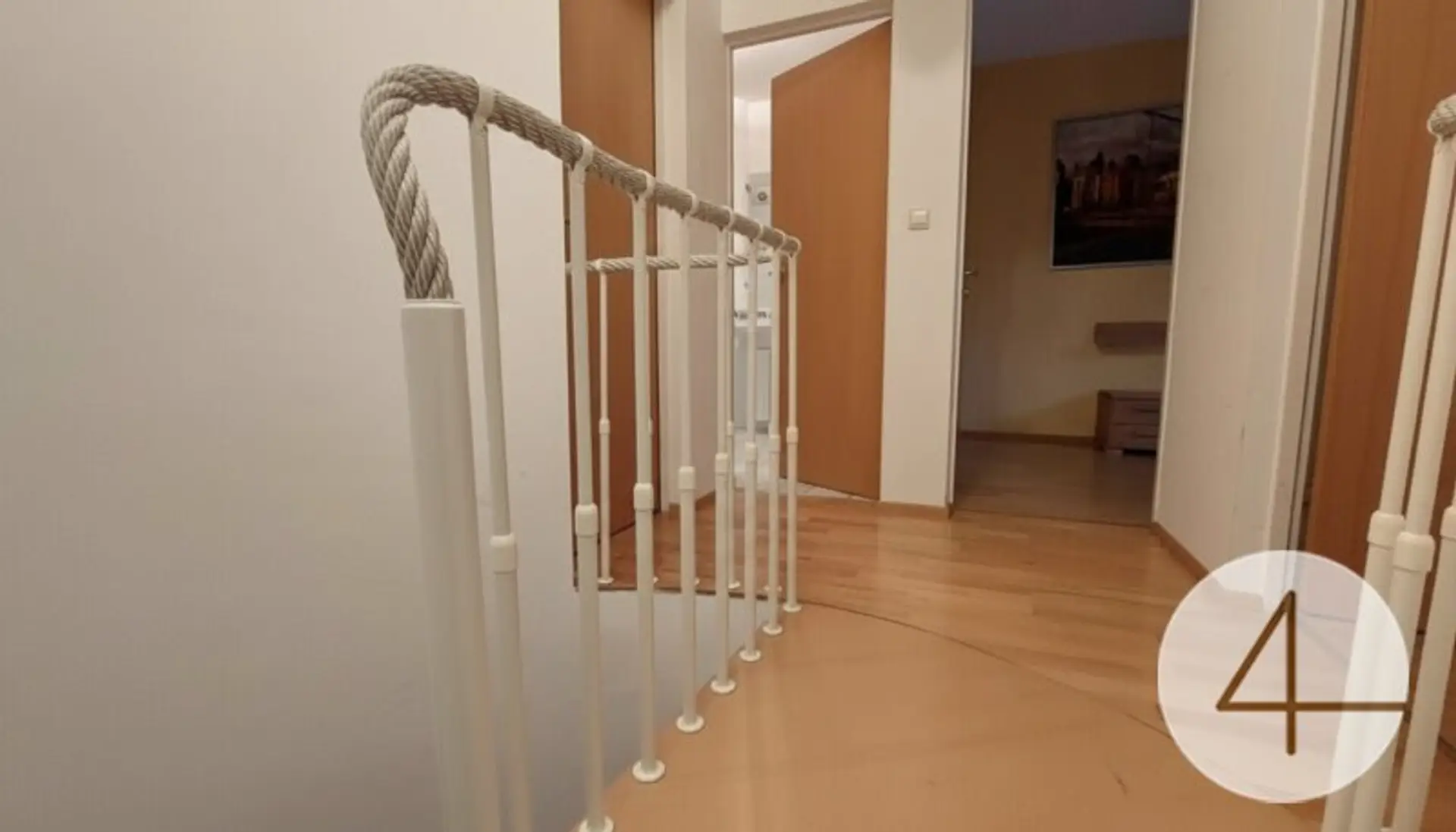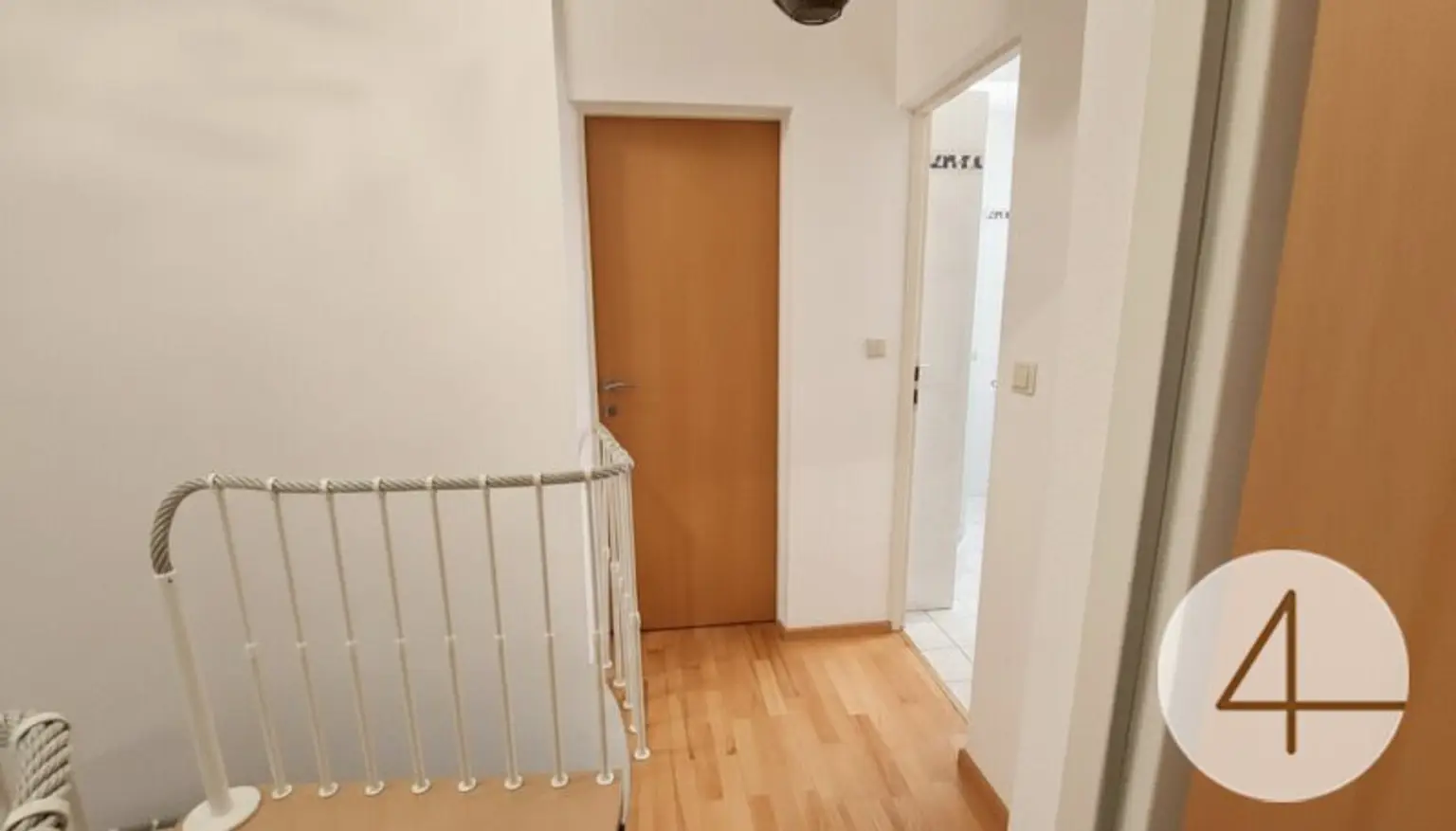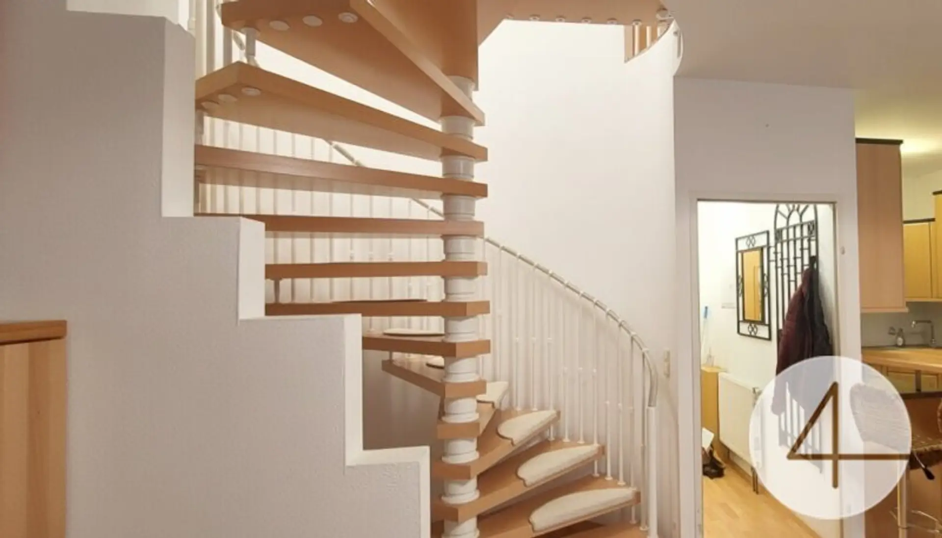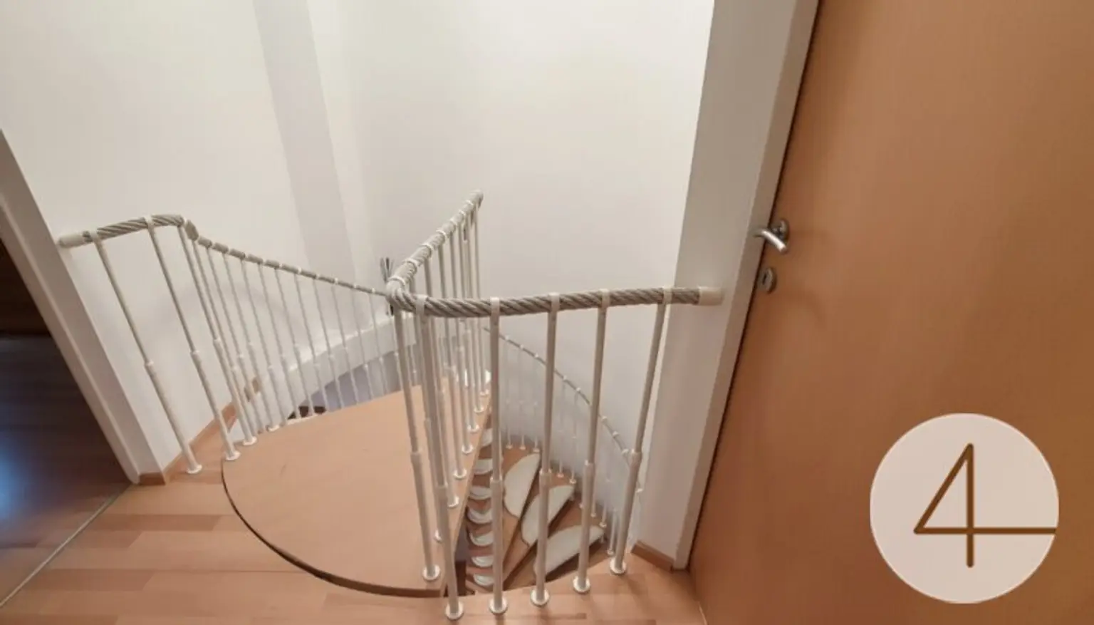 Aufgang über eine Wendeltreppe in den ersten Stock, hier befindet sich das helle Badezimmer und zwei Schlafzimmer, Technikraum;