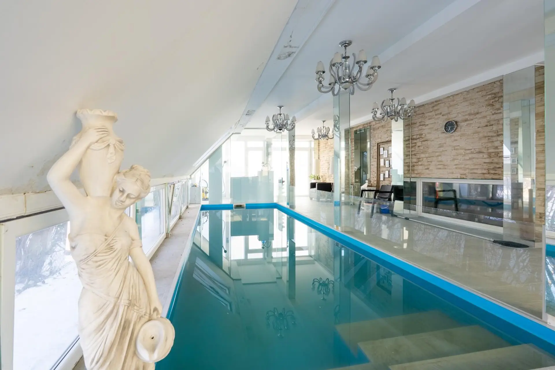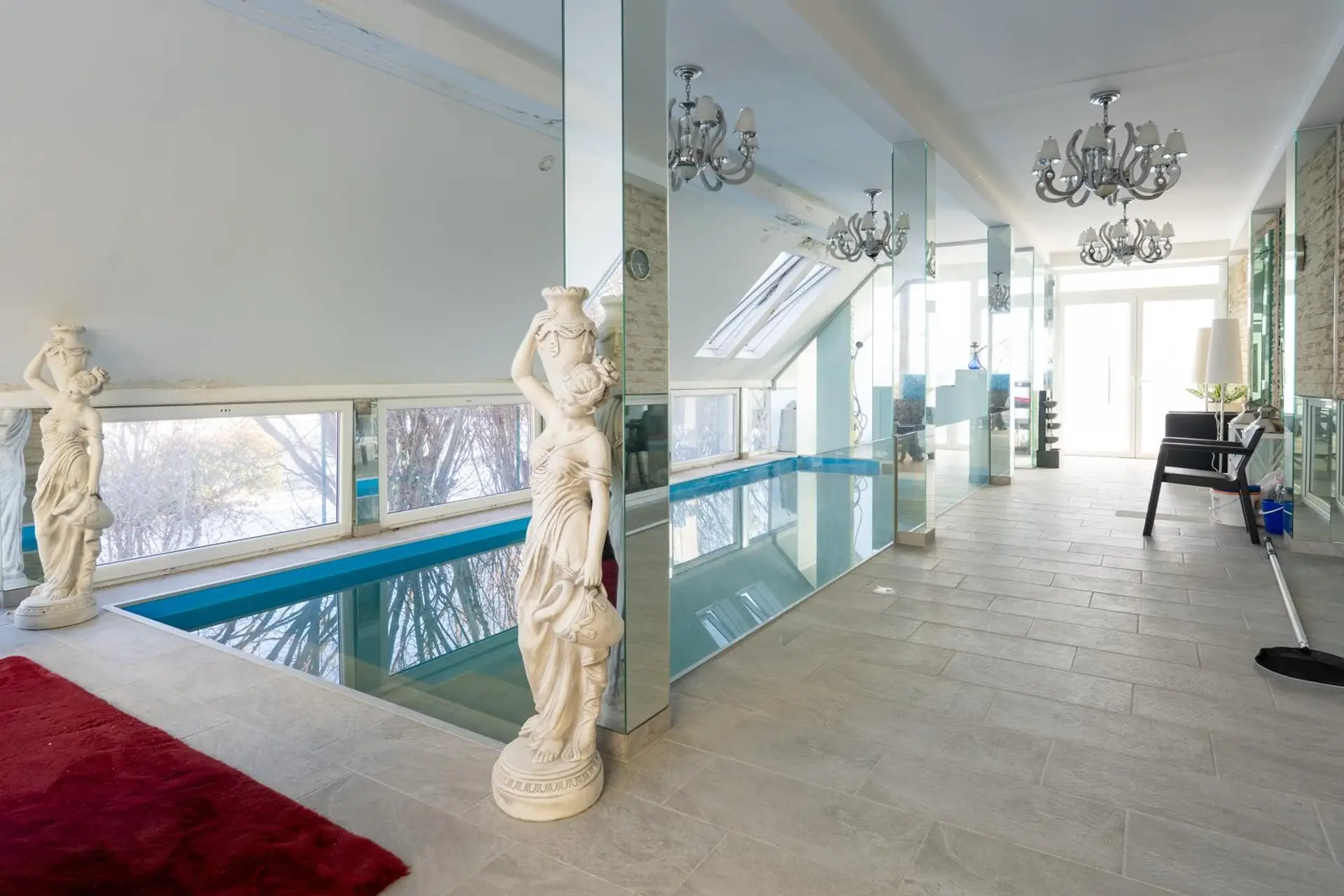Ein besonderes Highlight ist der exklusive Wintergarten mit Indoor-Pool (ca. 8 x 4 m). Hier verschmelzen Wellness, Entspannung und Luxus zu einem einzigartigen Wohngefühl – ergänzt durch einen separaten Duschbereich und WC.