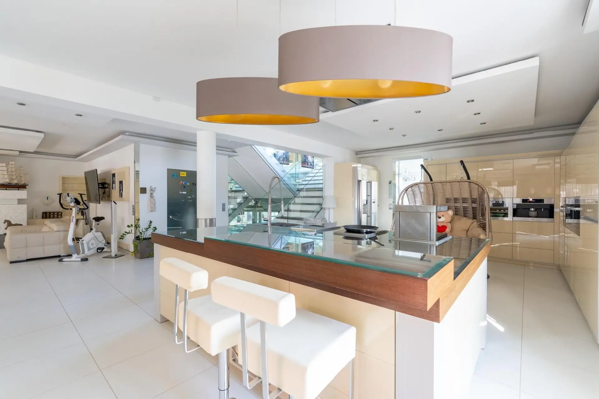 Der großzügige Wohnbereich mit stilvollem Kamin bildet das Herzstück des Hauses – ein Ort für entspannte Abende, elegante Empfänge oder ruhige Stunden im Kreis der Familie. Die offene Wohnküche mit separatem Essbereich verbindet Funktionalität mit ästhetischem Anspruch und lädt zu kulinarischen Erlebnissen ein.