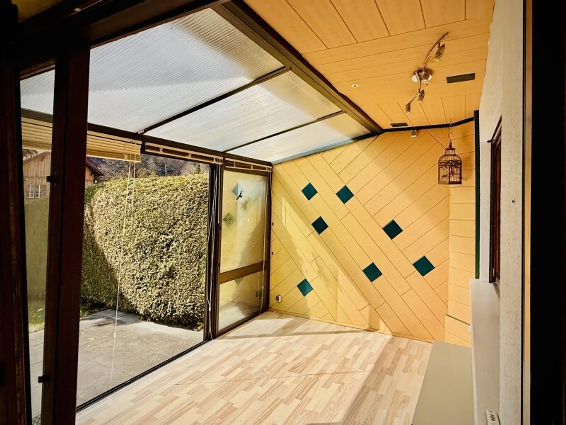 * großzügiger Wintergarten mit elektrischer Außenbeschattung und direktem Zugang in den Garten.