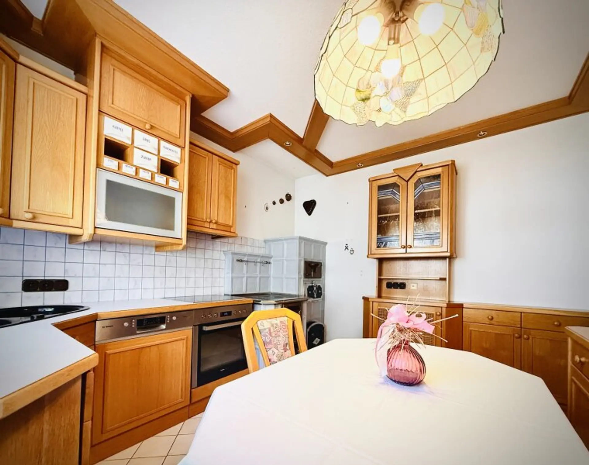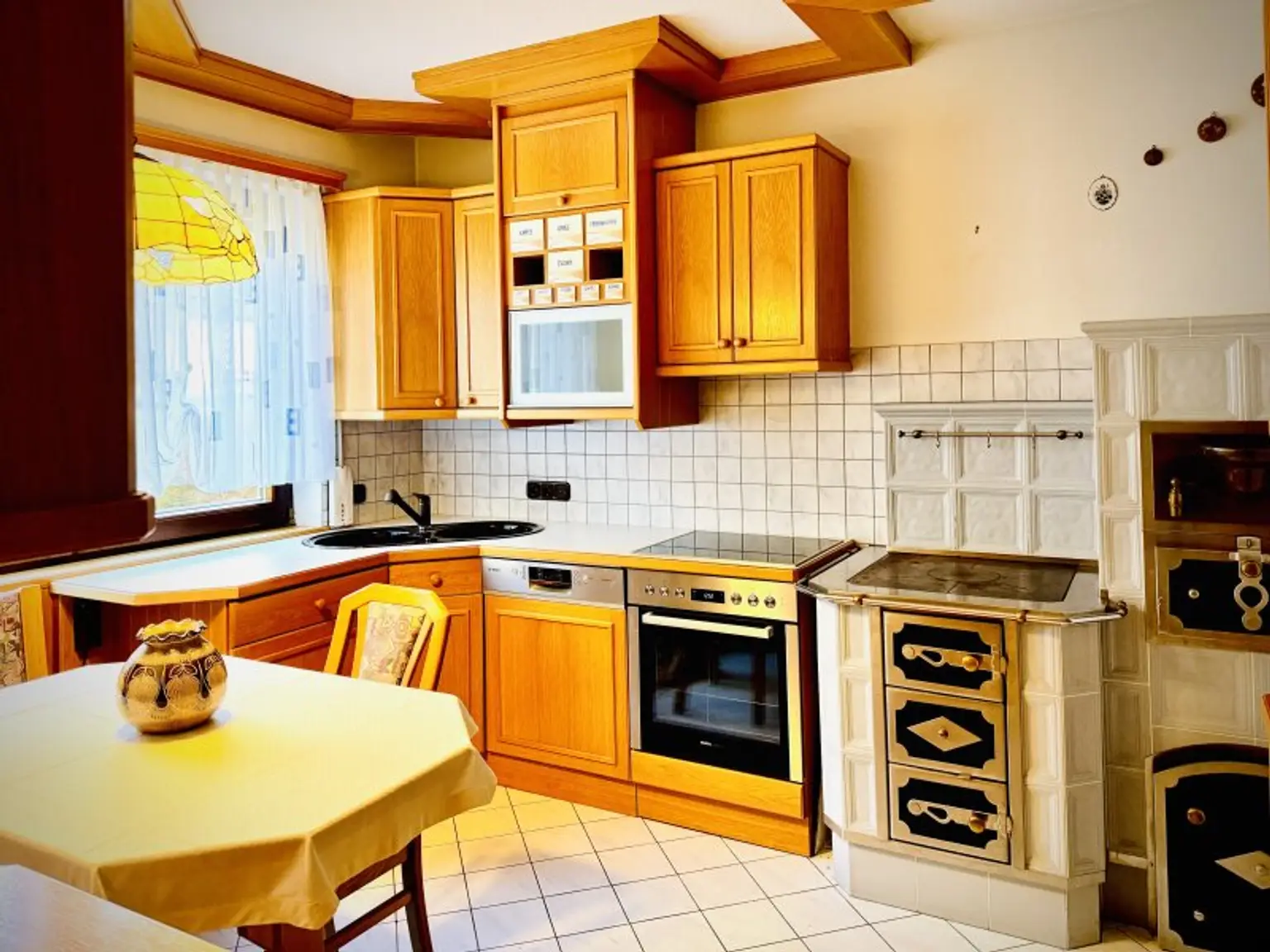* sonnendurchflutete Küche mit Essplatz, Cerankochfeld, Tischherd, Doppelspüle und hochwertiger Ausstattung,