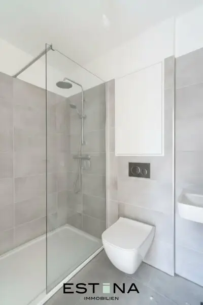 - Badezimmer mit Dusche, Waschbecken und Toilette