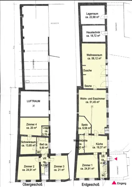 Das zweigeschoßige Wohnhaus verbindet historischen Charme mit moderner Ausstattung. Highlights sind die offene Küche mit hochwertigen Geräten, ein beeindruckendes Wohn-/Esszimmer mit ca. 51 m² und Galeriehöhe, ein Wellnessbereich (Sauna) sowie mehrere Schlafzimmer, Bad, Schrankraum und Loggia. Beheizung via Pellets (2022) und Kamin.