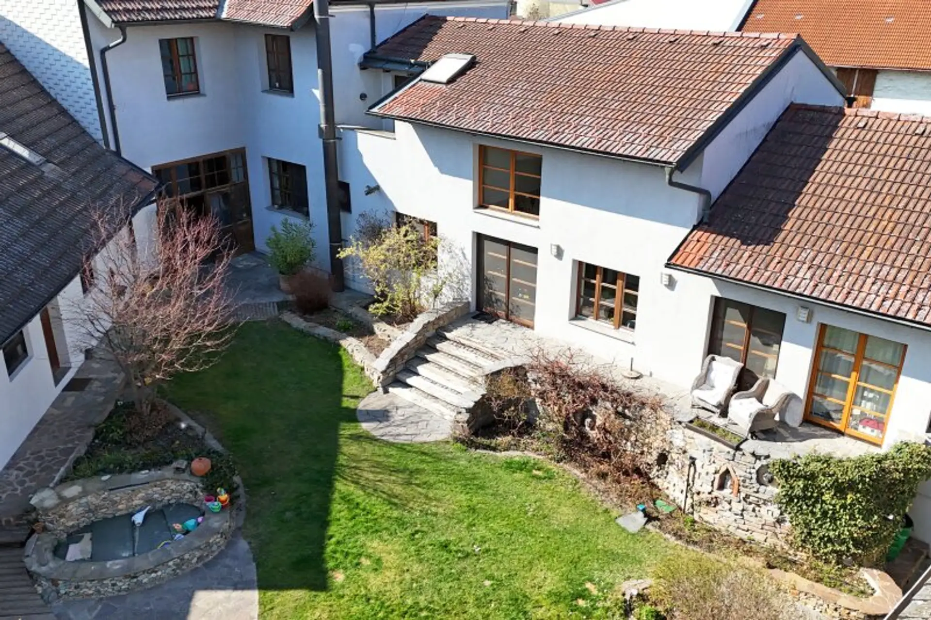 Das Herzstück bildet der liebevoll gestaltete, uneinsehbare Innenhof mit Garten, schattiger Laube, Terrassen und automatischer Bewässerung – ein idyllischer Rückzugsort.