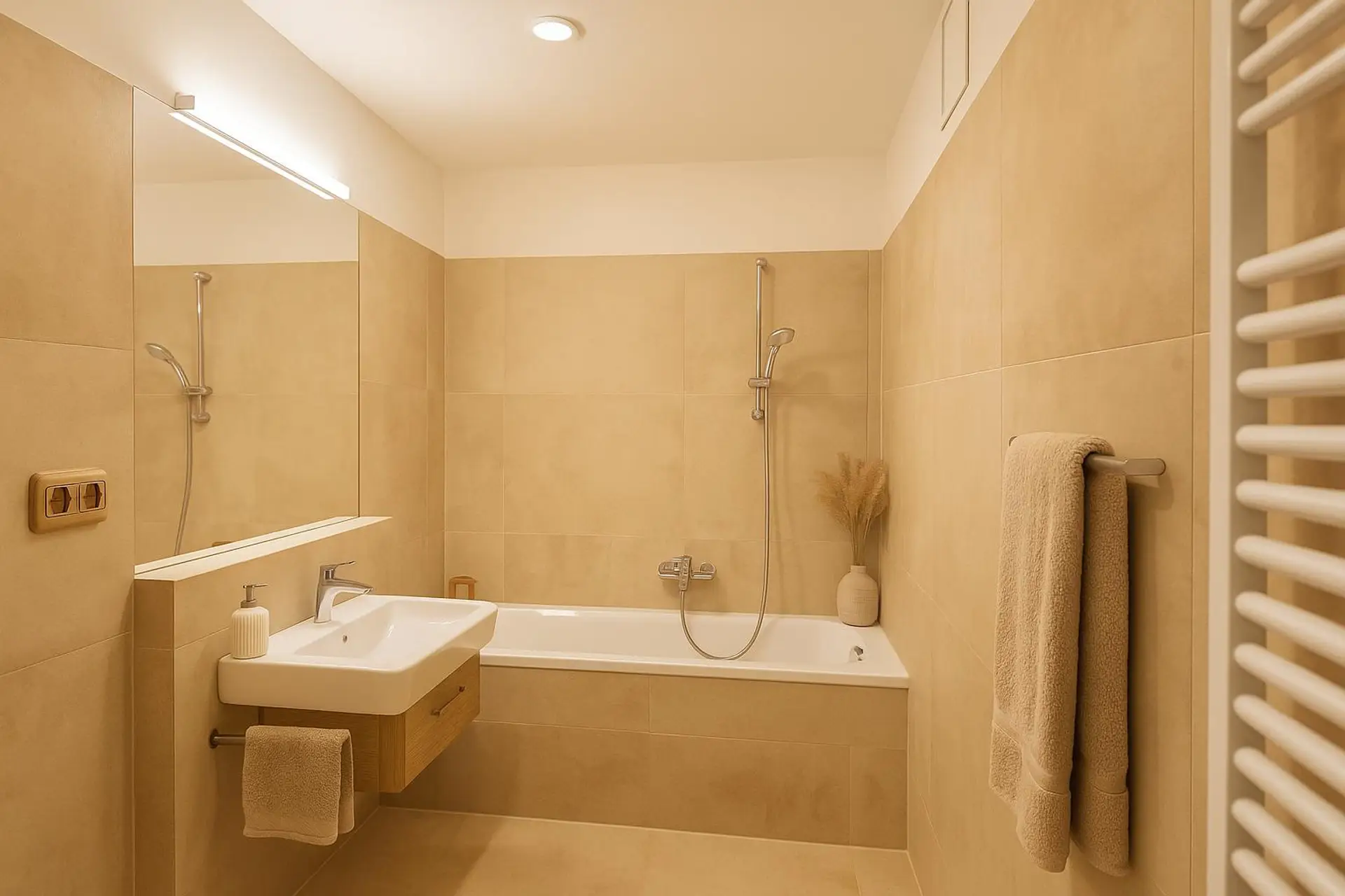 Fein abgestimmte Materialien, großformatige Fliesen und hochwertige Armaturen vereinen Funktionalität und Design. Die elegante Badewanne lädt zum Entspannen ein – Ihr persönlicher Rückzugsort nach einem langen Tag.