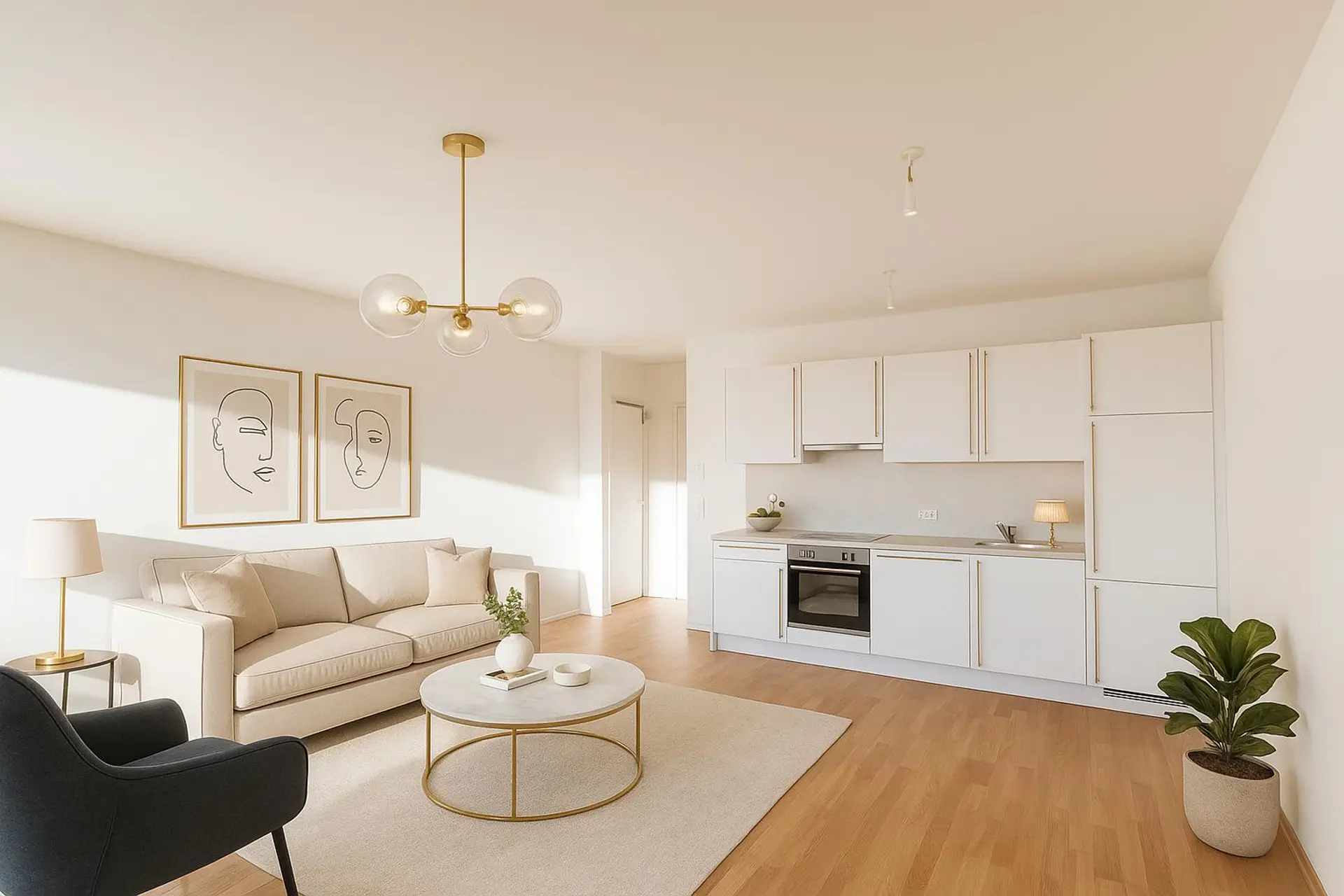 Das Herzstück der Wohnung ist der großzügige, lichtdurchflutete Wohnbereich mit offener Küche. Bodentiefe Fenster lassen das Tageslicht tanzen und schaffen ein Gefühl von Weite. Ob gemütliches Frühstück, gesellige Abende oder entspannte Stunden zu zweit – dieser Raum passt sich Ihrem Leben an.