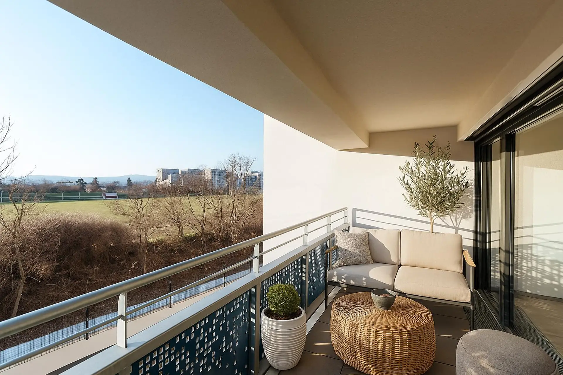 Die großzügige, überdachte Loggia erweitert den Wohnraum ins Freie. Hier wird aus einer Tasse Kaffee ein kleines Ritual – umgeben von Pflanzen, Sonne und frischer Luft.