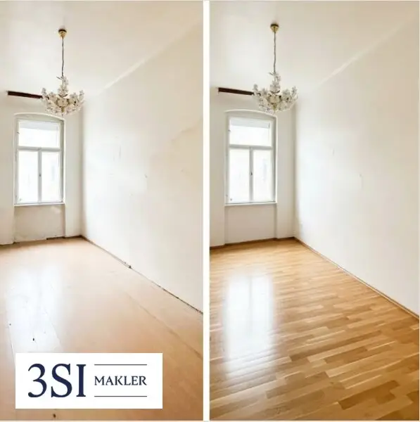 Das Titelbild vermittelt einen Eindruck vom aktuellen Zustand der Wohnung und zeigt zugleich, wie sie nach einer umfassenden Sanierung aussehen könnte.