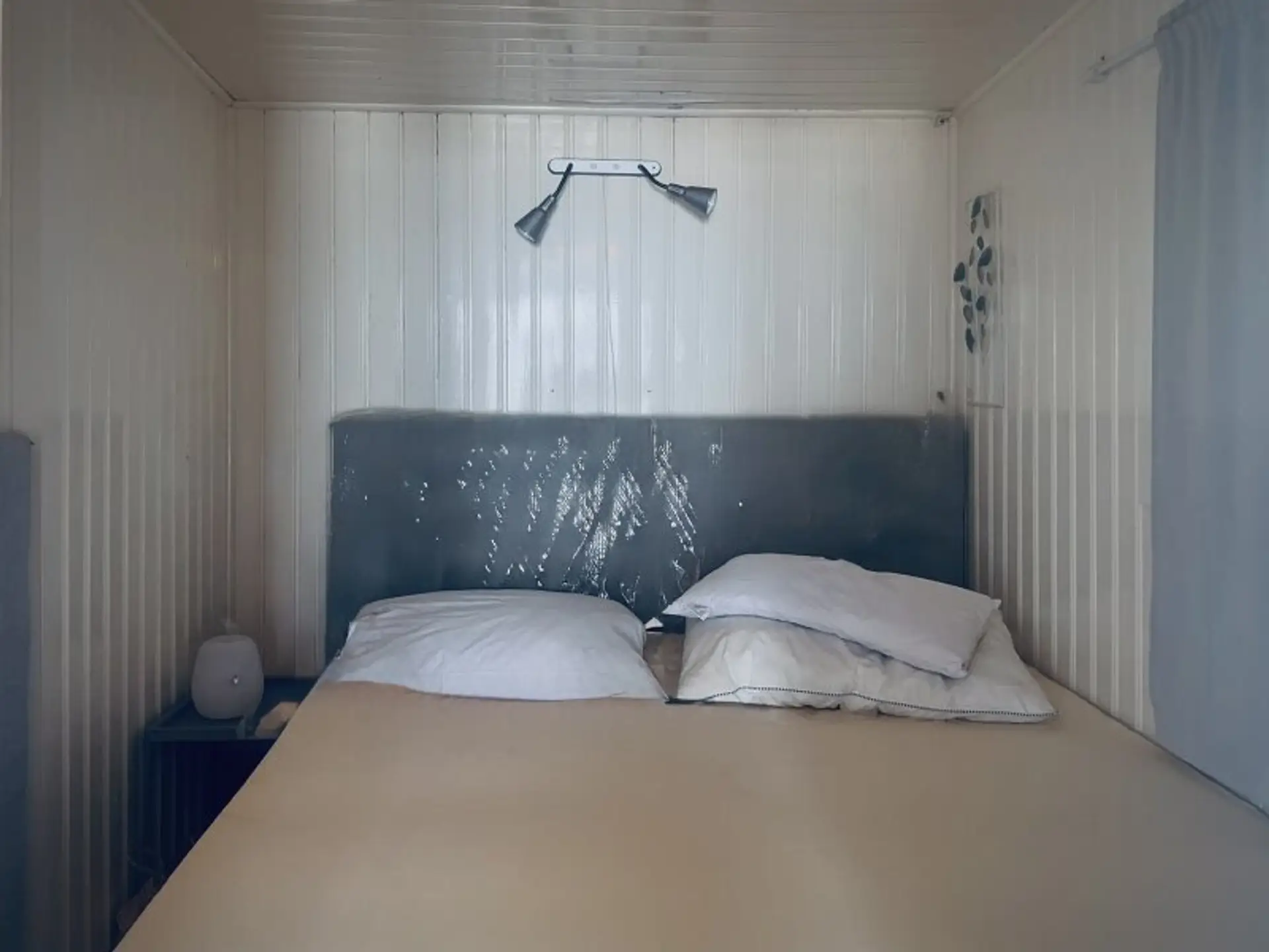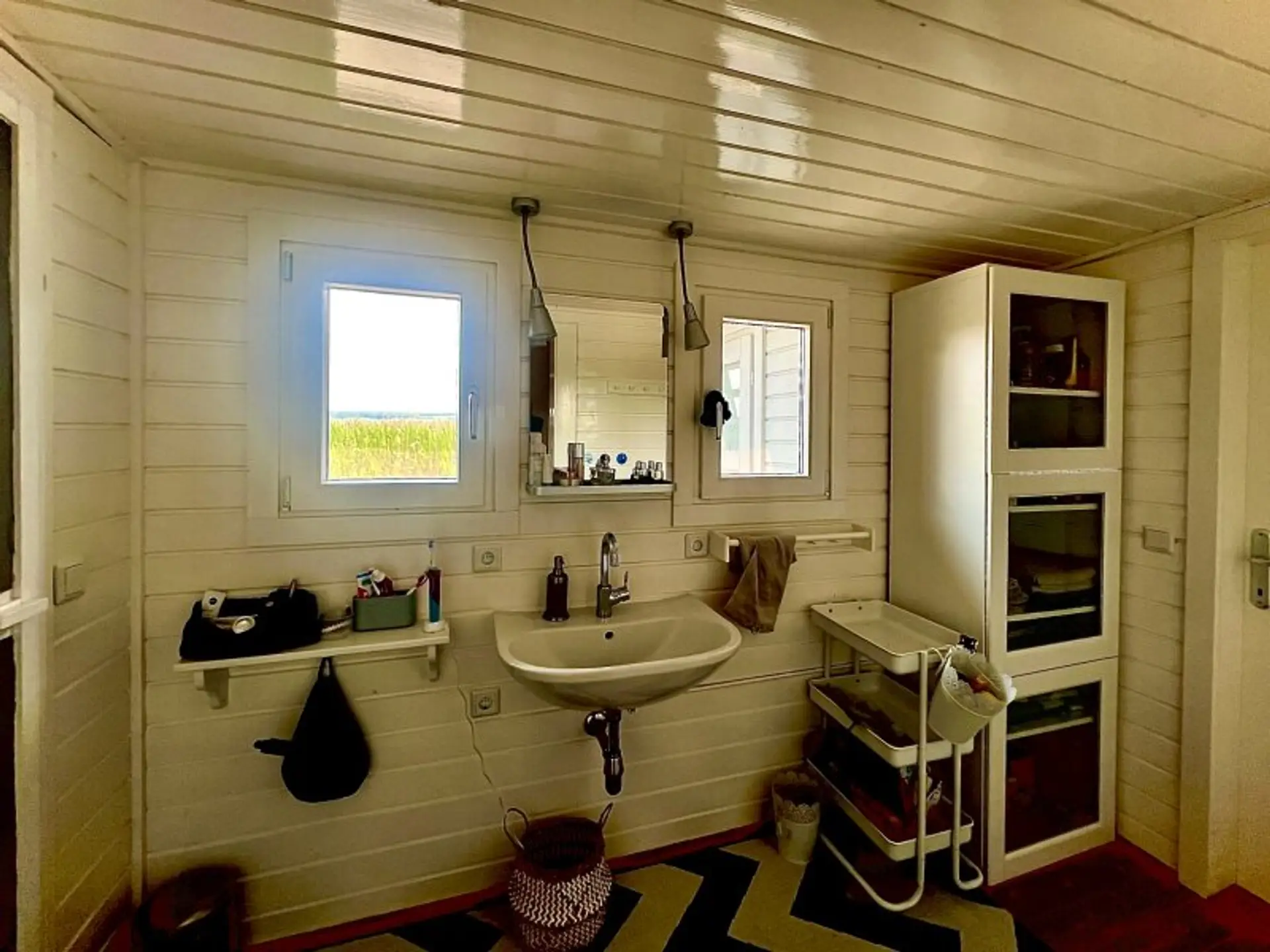 Anschließend an die Wohnküche finden Sie ein Schlafzimmer mit Doppelbett. Außerdem bietet das Häuschen ein zentral begehbares sowie geräumiges Badezimmer mit Waschtisch und Ablageflächen.