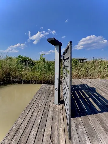 Die Dusche befindet sich im Freien, wind- und blickgeschützt auf dem westseitigen Plateau hinter den Hütten.