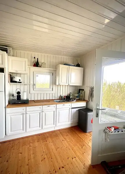Im Haupthaus finden Sie die einladende Wohnküche mit großartigem Ausblick. Dieser Raum bietet einen Ruheplatz mit Sofas und eine voll ausgestattete Einbauküche - mit Geschirrspüler, Kühlschrank und einer Kochplatte (mit Gas).