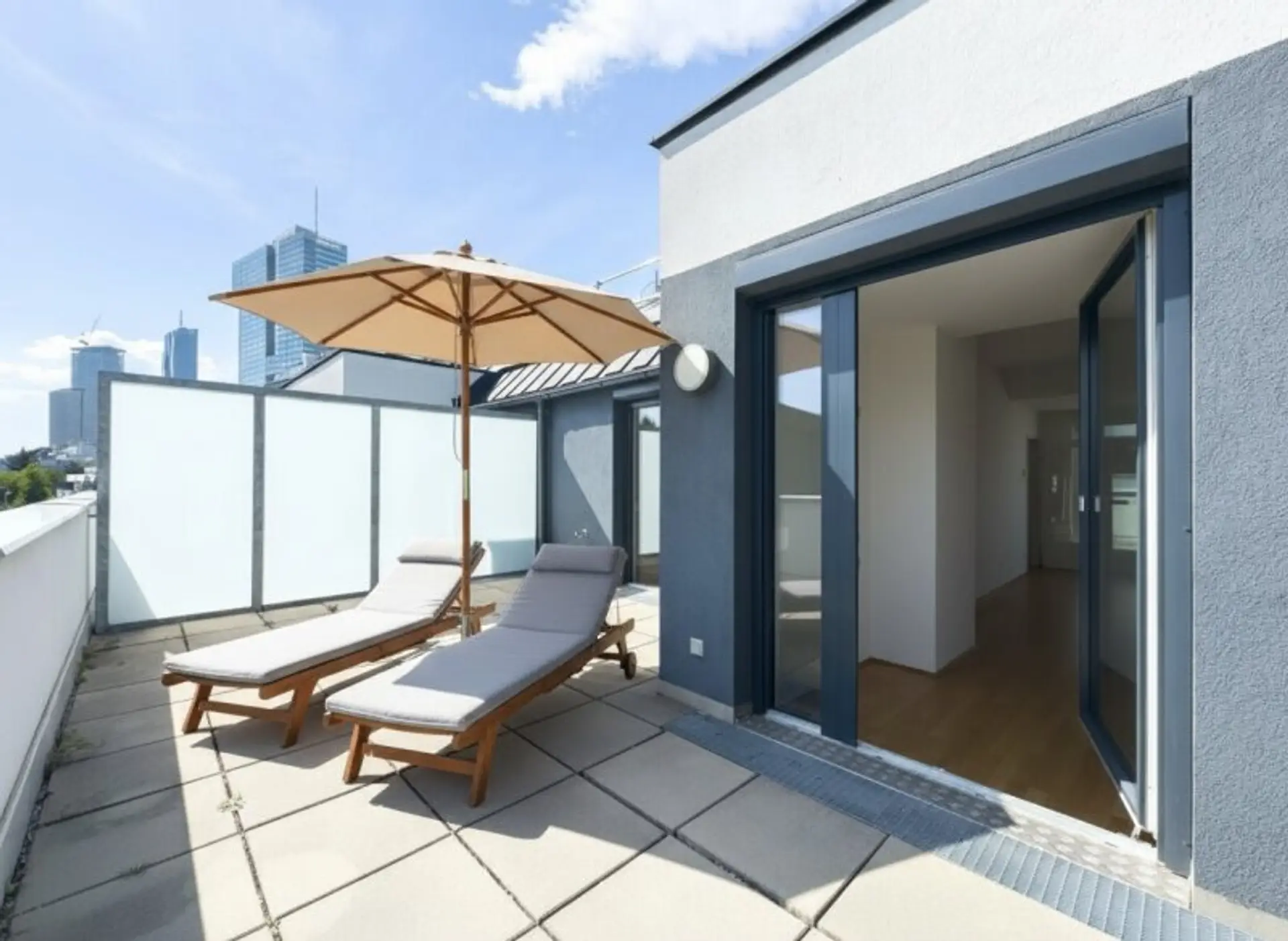 Das Vorzimmer führt auf direktem Wege in das sonnige Herz der Wohnung, das Wohnzimmer mit voll ausgestatteter offener Küche. Die beiden gemütlichen Schlafzimmer, welche über das Wohnzimmer zu erreichen sind, halten hochwertige Einbau-Tischlermöbel bereit, welche im Verkaufspreis inkludiert sind. Eines der Schlafzimmer bietet außerdem einen geräumigen Abstellraum und einen direkten Zugang auf die Hauptterrasse. Das andere Schlafzimmer bietet eine eigene, separate Terrasse. Die drei Terrassen stellen das absolute Highlight der Wohnung dar. Sie bieten einen Ausblick auf den DC Tower im Westen sowie die Alte Donau im Osten und damit ein unvergleichbares Zusammenspiel aus urbanem und naturnahem Wohnen. Das Badezimmer mit Wanne und Waschmaschinenanschluss sowie das separate WC mit Waschbecken sind ebenfalls über das Vorzimmer zu erreichen.