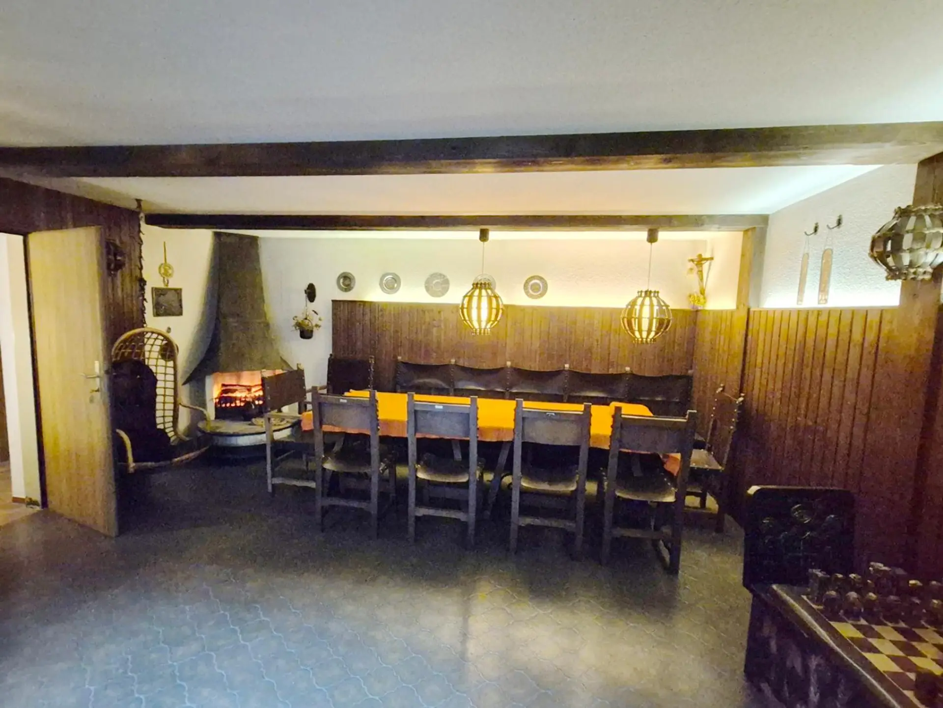 Im Erdgeschoß befindet sich die Küche, der Essbereich, das gemütliche Wohnzimmer sowie ein Gästezimmer, ein Arbeitsraum und ein geräumiger Garderobenbereich mit Zugang zur Garage. Der Flur bietet Zugang auf die große Terrasse und den gepflegten Garten. Ein Swimmingpool ist vorhanden, muss allerdings saniert werden.