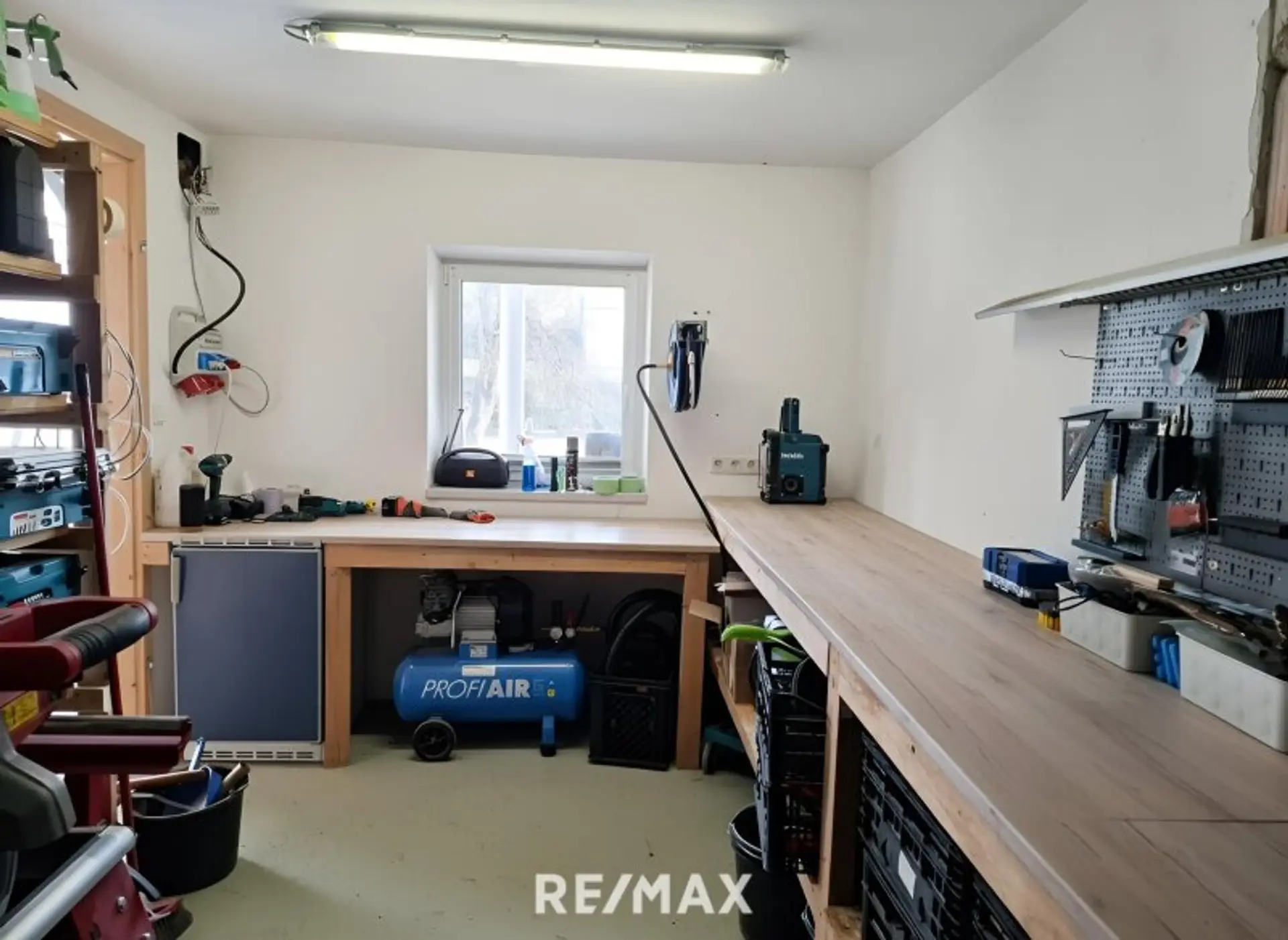 Die Garage verfügt über einen hochwertigen Epoxidharzboden und bietet gemeinsam mit einer separaten Werkstatt ideale Voraussetzungen für Hobbyhandwerker oder zusätzlichen Stauraum.