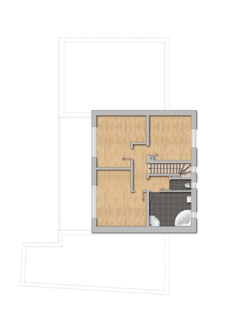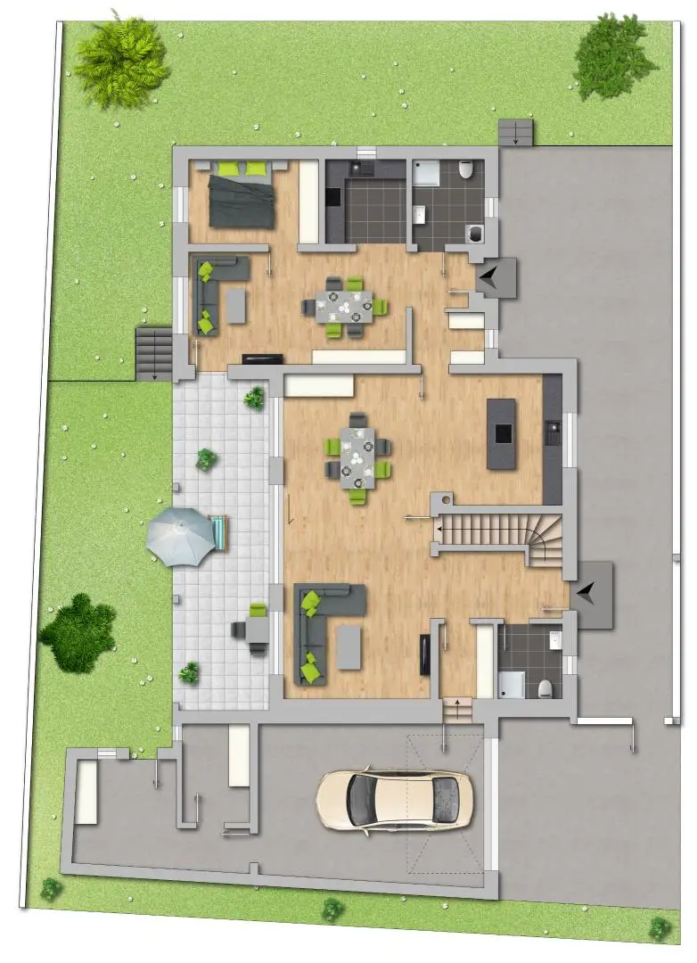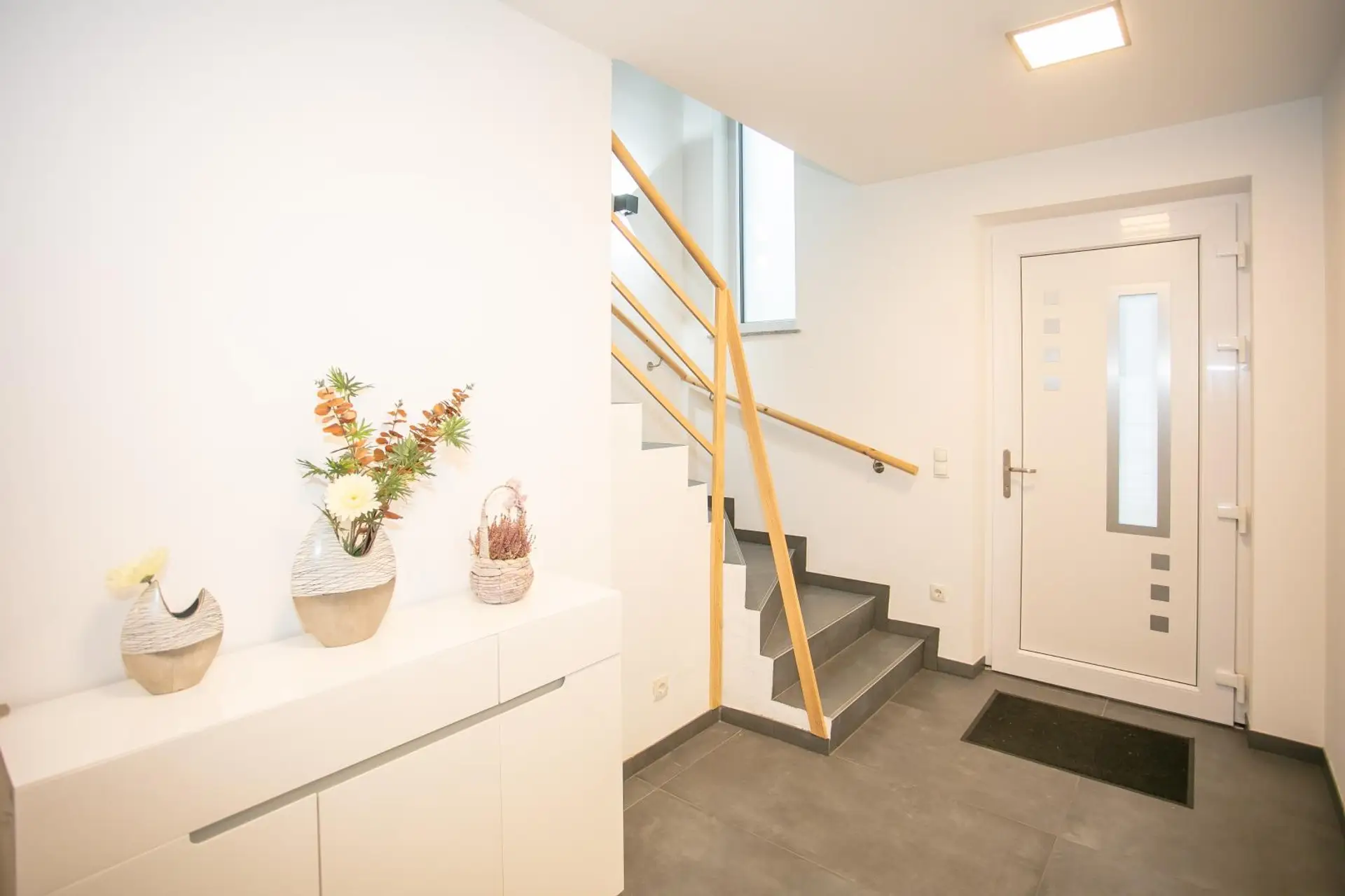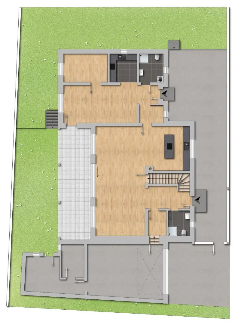 Das Erdgeschoss beherbergt zwei getrennte Wohneinheiten, jeweils mit eigenem Zugang und klar strukturierter Raumaufteilung.