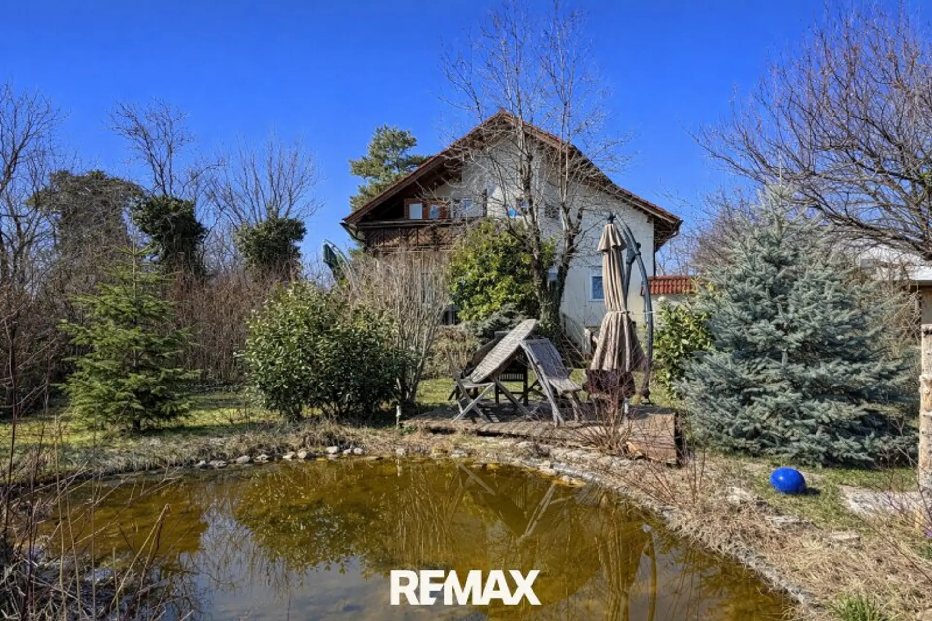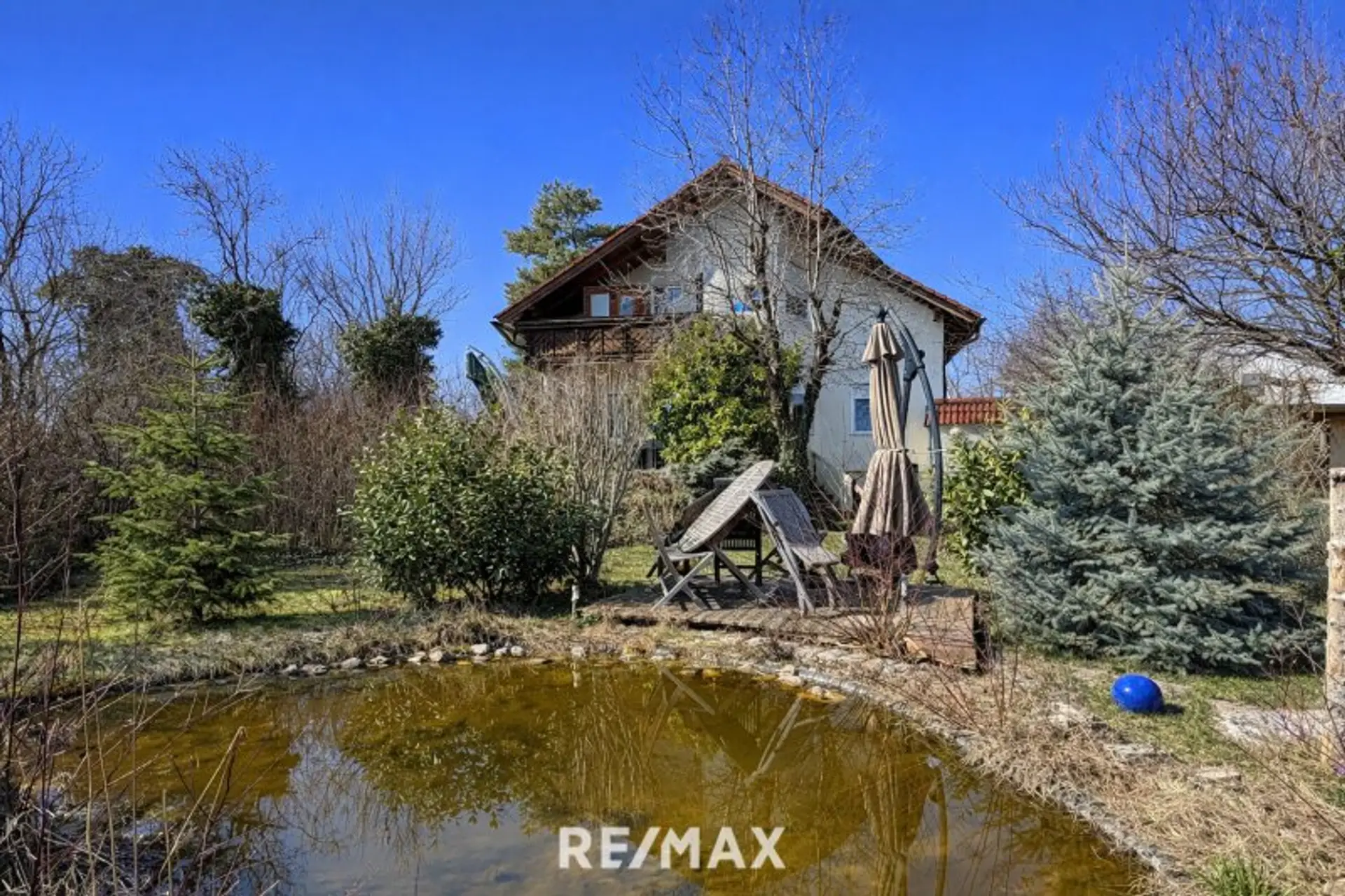 Der liebevoll angelegte Garten bietet Privatsphäre und optimale Sonnenausrichtung. Die großzügige Terrasse lädt zu geselligen Abenden ein, während der Naturteich an heißen Sommertagen für Erfrischung sorgt.