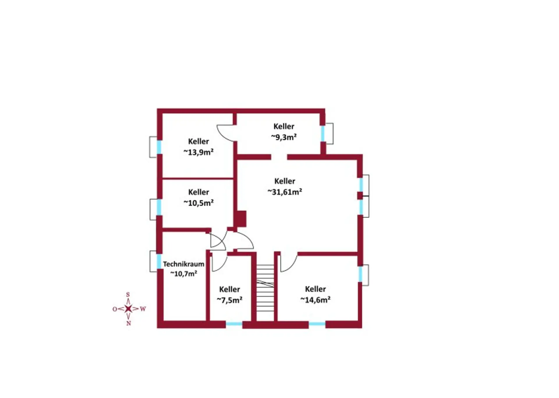 Im Keller sind mehrere heizbare Räume mit ein wenig Tageslicht vorhanden. Ein 31 m² großer Raum würde sich bestens als Heimkino, Partyraum oder Fitnessraum eignen. Drei weitere trockene Kellerräume dienen als Stauraum und für die Haustechnik.