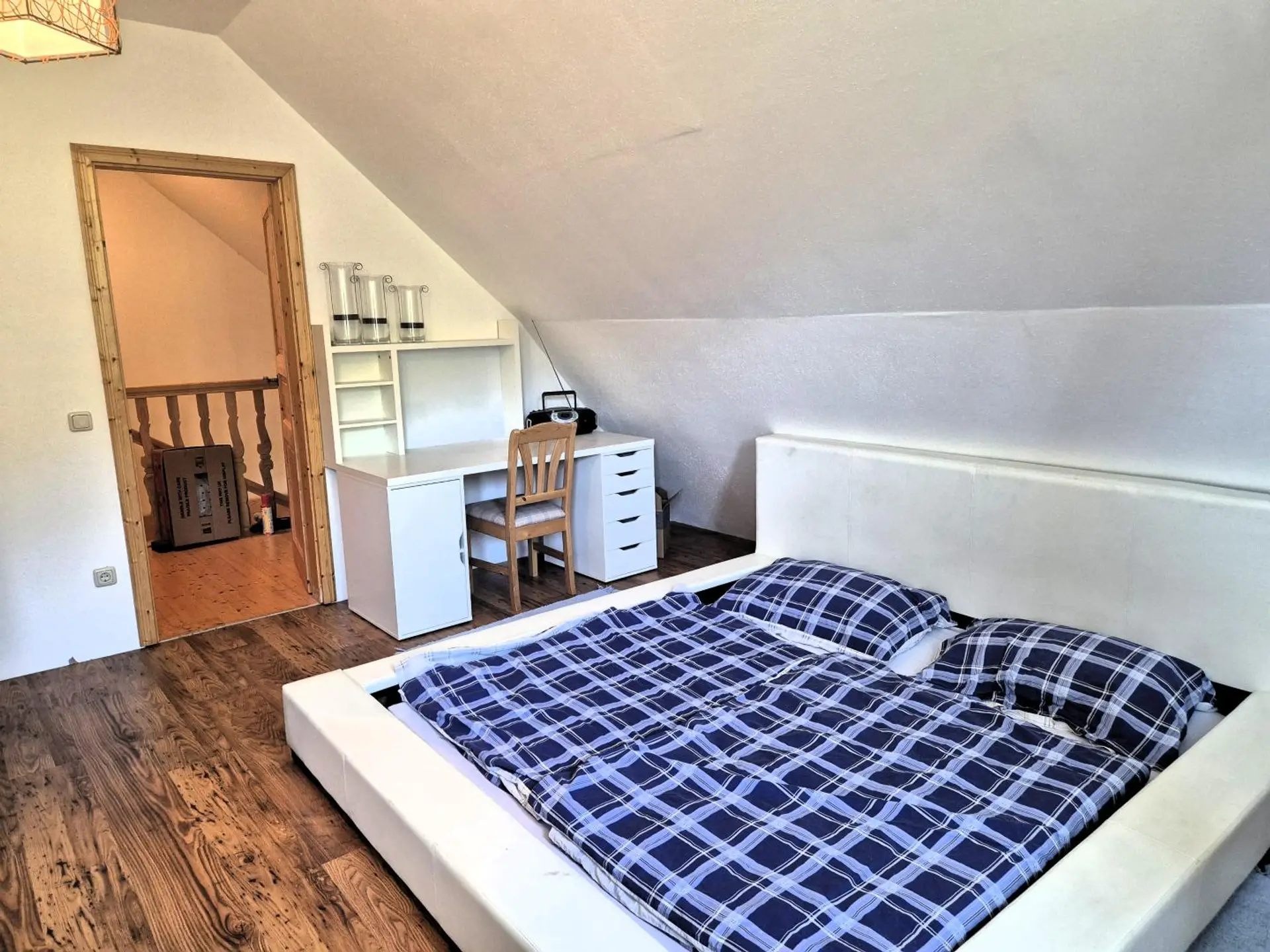 Über die wunderschöne, maßgefertigte Holzstiege vom Tischler gelangen Sie vom Erdgeschoss bis ins Dachgeschoss. Hier befinden sich zwei Schlafzimmer, ein kleines Zimmer sowie ein begehbarer Schrank – perfekt für Kinder, Gäste oder Homeoffice. Zwei Räume sind aktuell noch nicht ganz fertiggestellt und warten darauf, nach Ihren Wünschen gestaltet zu werden.