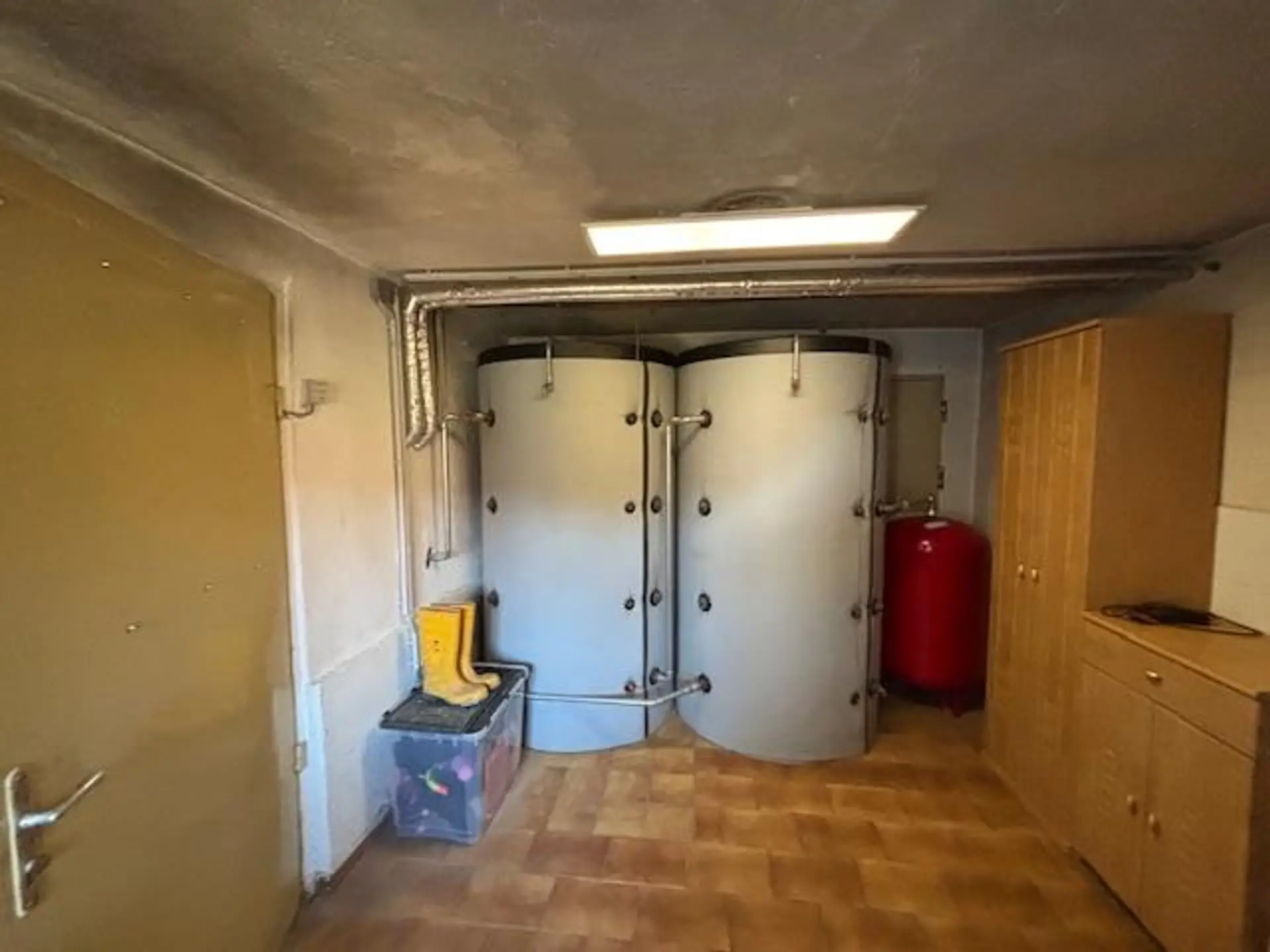 Zentralheizung (feste Brennstoffe) mit 2 riesigen Pufferspeichern (je 1250 L), Solar für Warmwasser im Sommer. Für schnelles Internet ist
