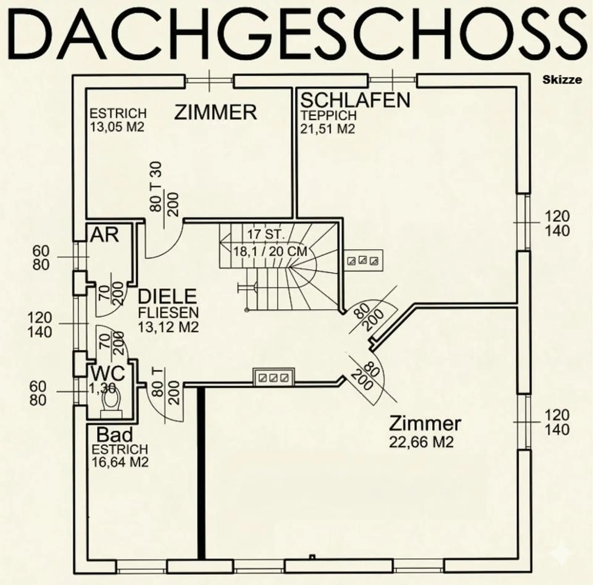 Das Dachgeschoss beeindruckt mit knapp 90 m² Wohnfläche. Über eine zentrale Diele erreichen Sie drei geräumige, helle Zimmer (ca. 13 m² und 21,5 m² und 22,6 m²), die sich ideal als Kinder-, Gäste- oder Arbeitszimmer eignen.