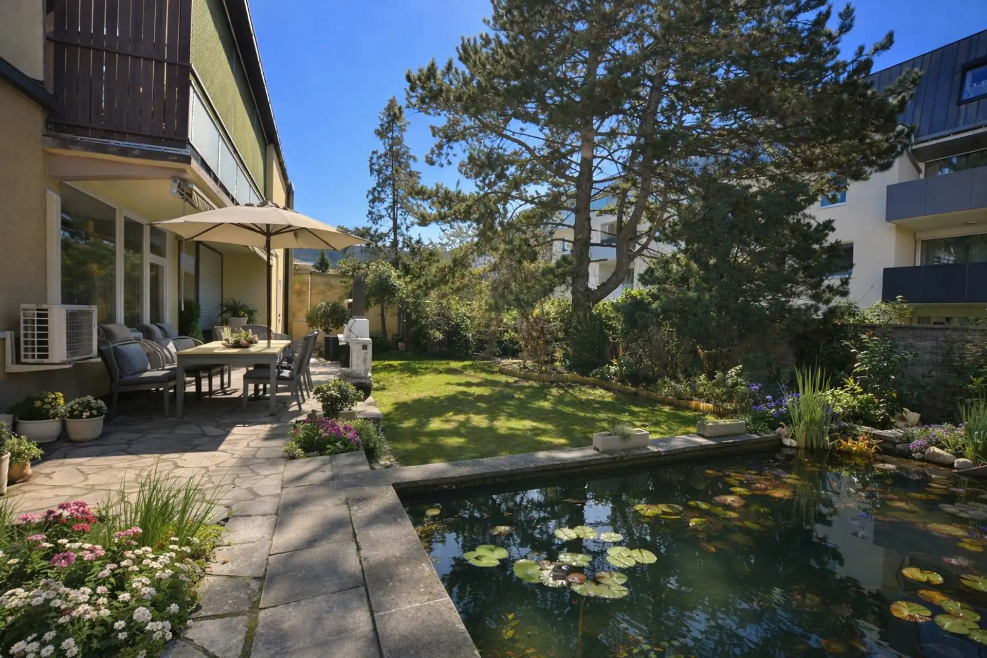 Der liebevoll angelegte Außenbereich überzeugt mit einer schönen Terrasse, einem Biotop sowie ausreichend Platz für entspannte Stunden im Freien – sei es beim Grillen mit Freunden, beim Sonnenbaden oder bei gemeinsamen Mahlzeiten im Freien mit der Familie. Ein zusätzlicher Balkon bietet einen weiteren Rückzugsort mit Blick ins Grüne.