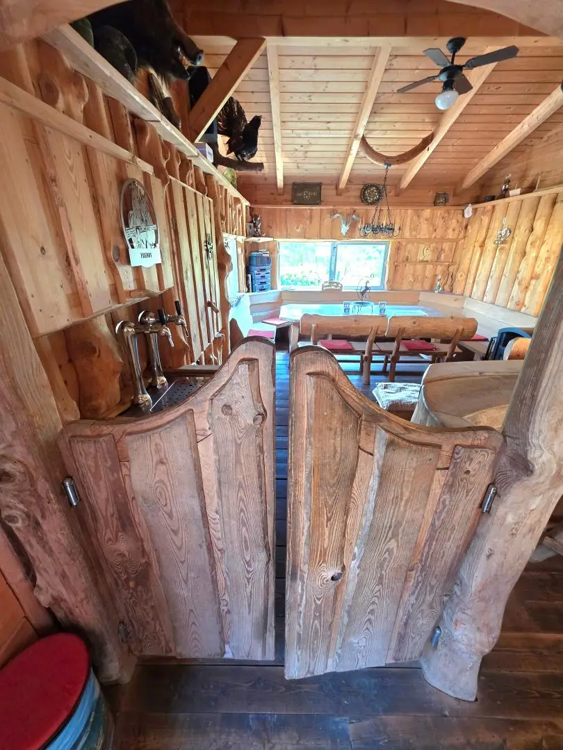 Saloon: Holzblockhaus beheizt mit Partyraum, Bierschank, Theke