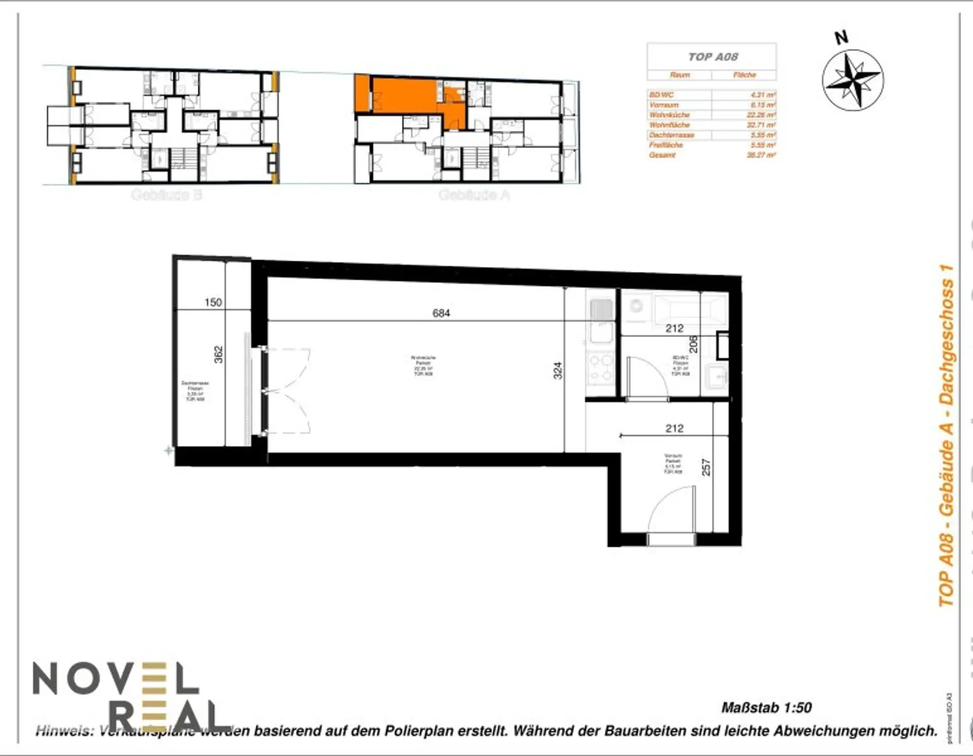 Diese Dachgeschoss-Wohnung überzeugt durch eine kompakte und zugleich funktionale Raumaufteilung. Der Vorraum bietet einen angenehmen Empfangsbereich mit Platz für Garderobe und Stauraum. Die Wohnküche ist offen gestaltet und schafft eine helle, einladende Atmosphäre für gemeinsames Kochen und Wohnen. Das Badezimmer mit WC ist modern ausgestattet und sorgt für Komfort im Alltag. Die Dachterrasse erweitert den Wohnraum ins Freie und bietet einen geschützten Platz zum Entspannen – ideal für ruhige Stunden oder den Start in den Tag.